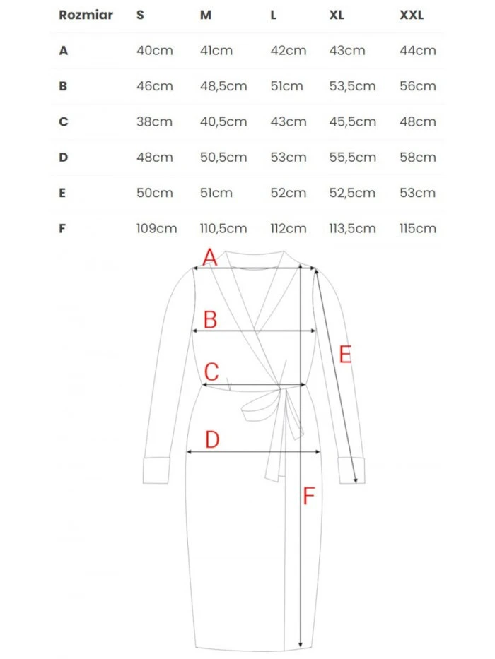 PODROBNOSTI O PRODUKTU Výstřih: zavinovací výstřih do V Límec: šálový límec Rukávy: 7/8 délky s ohrnutými manžetami Pas: zvýrazněný páskem Zapínání: zavazování v pase Kapsy: žádné Podšívka: částečně podšitá Model: S415 Navrženo a vyrobeno v Polsku Modelka je vysoká 174 cm a nosí velikost S STYL A STŘIH Styl: zavinovací šaty Tvar: vypasovaný vršek, rovná sukně s mírným uvolněním Délka: pod kolena