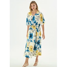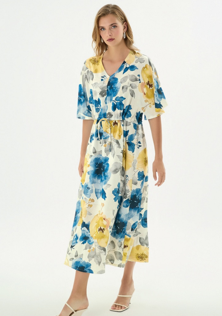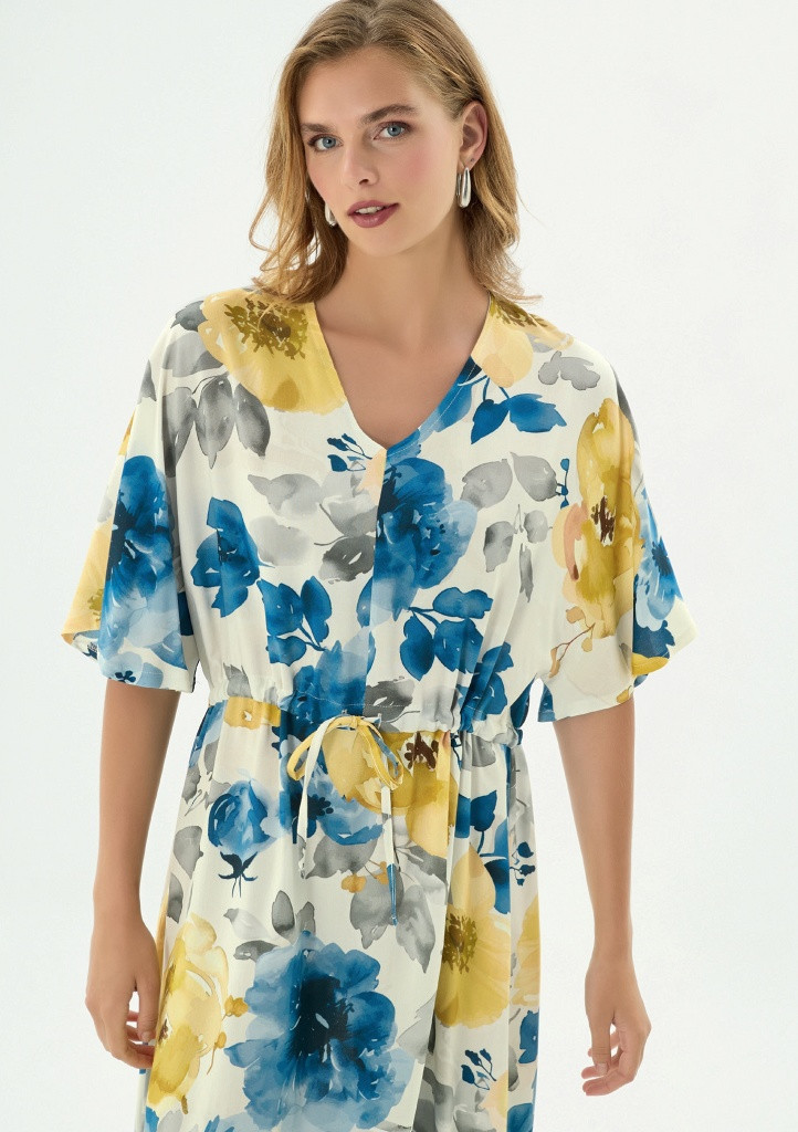 Lehké letní šaty z viskózy jsou ideální volbou pro horké dny, kdy oceníte především pohodlí a vzdušnost. Příjemný materiál krásně splývá, je prodyšný a jemný na dotek. Šaty mají krátké, lehce prodloužené splývavé rukávy, které dodávají modelu eleganci a volnost pohybu. Výstřih do V opticky prodlužuje siluetu a působí velmi ženským dojmem. V pase jsou šaty opatřeny šňůrkou, díky které si je snadno přizpůsobíte podle své postavy. Perfektní kousek na letní procházky, dovolenou i každodenní nošení.