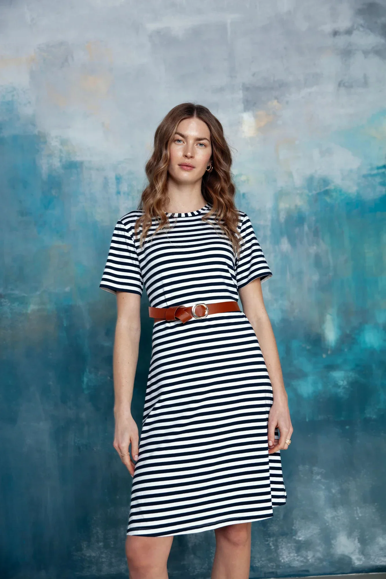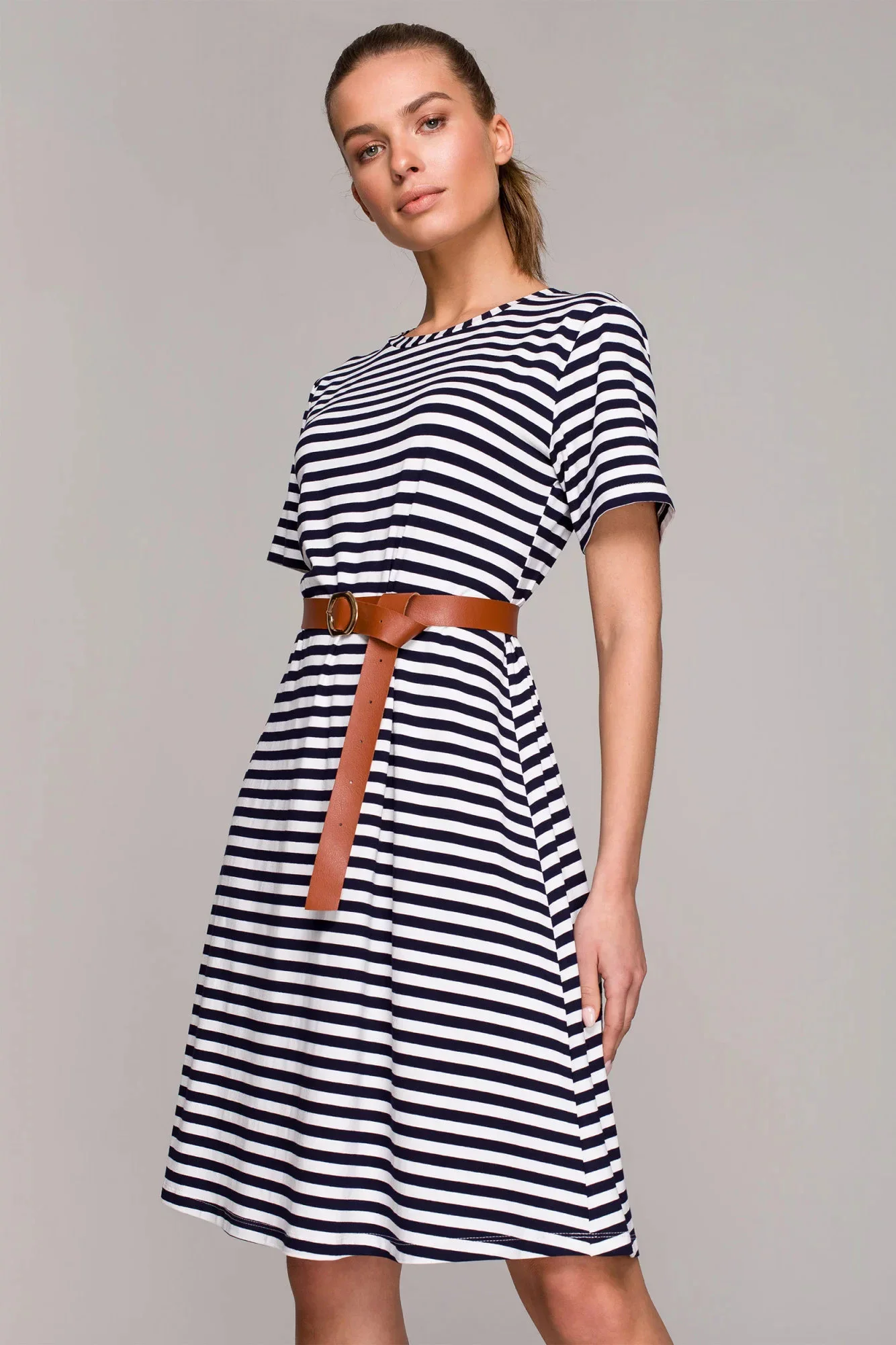Pruhované viskózové žerzeje. Šaty áčkového střihu. Délka nad kolena. Součástí balení je pásek s přezkou. Naše modelka je vysoká 174 cm a nosí velikost S.
