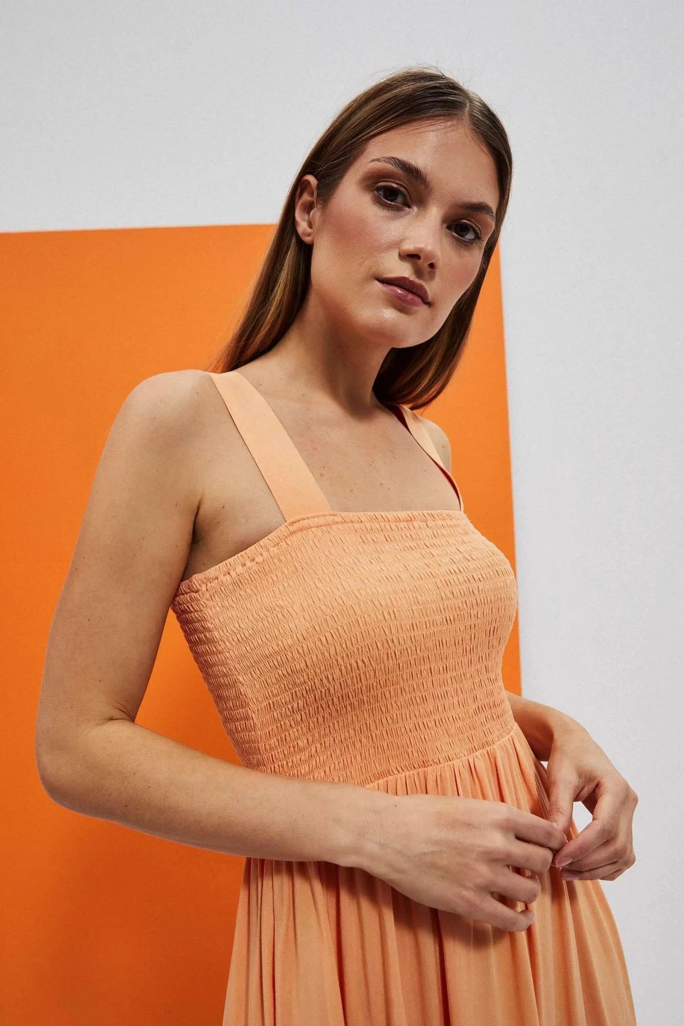 Extrémně ženské šaty, s otevřenými rameny, širokými ramínky. Oranžová barva. Hladké, bez vzorů. Horní část šatů je ve formě stahovací šňůrky. Dokonale se přizpůsobí postavě a zdůrazní ženské tvary. Spodní díl šatů je volný, volný a rozšířený. Délka nad kolena. Vyrobeno z příjemné na dotek a vzdušné viskózy. Ideální na pláž a každodenní styling. Ideální na léto, to musíte mít!