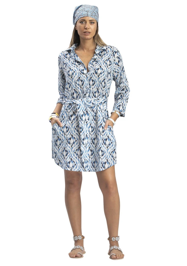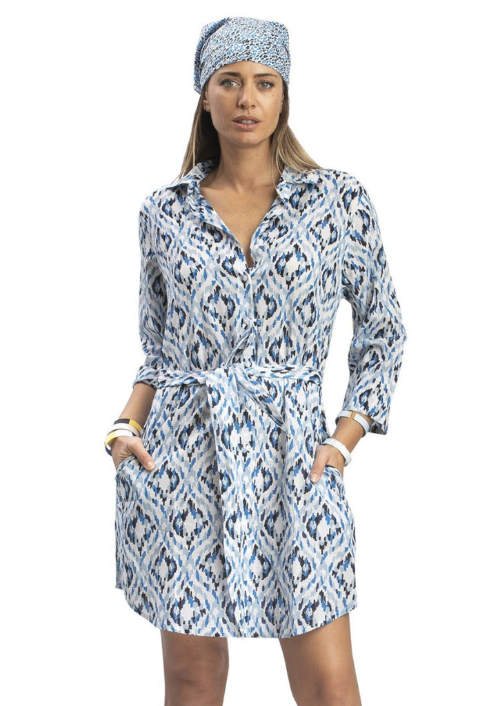 Stylová košilová tunika od francouzské značky Terre Rouge, která zaujme na první pohled svým moderním modro-bílým vzorem. Díky lehké tkanině, košilovému límečku, zapínání na knoflíčky a pásku v pase snadno vytvoříte ženský siluetový look. Tříčtvrteční rukávy a praktické kapsy doplňují pohodlný, ale elegantní střih. Noste ji samostatně jako šaty nebo přes plavky na pláž jako tuniku.