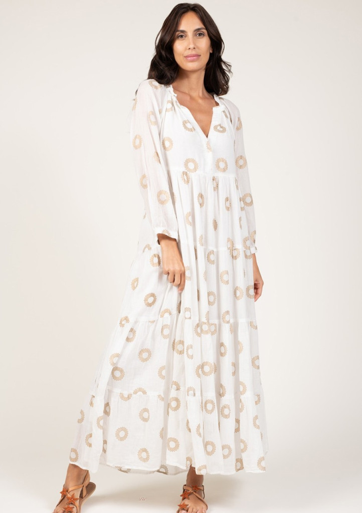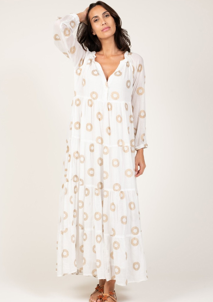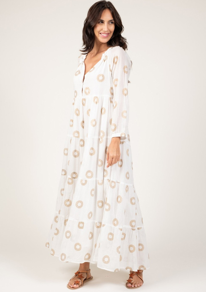 Lehkost, ženskost a francouzský šarm v jednom – to jsou tyto bílé maxi šaty od značky Terre Rouge. Jsou ušité z příjemného vzdušného materiálu, ideálního na teplé dny. Jemný zlatý vzor po celé délce dodává šatům nádech elegance a originality. Volný střih s nabíranými patry, výstřih do V a dlouhé rukávy zakončené gumičkou podtrhují uvolněný, ale stylový vzhled. Skvělé na dovolenou, letní oslavy i procházku městem.