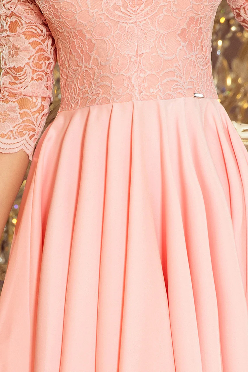 Přidání recenze k Dámské šaty v pastelově růžové barvě s delším zadním dílem a s krajkovým výstřihem model 7248157 - numoco