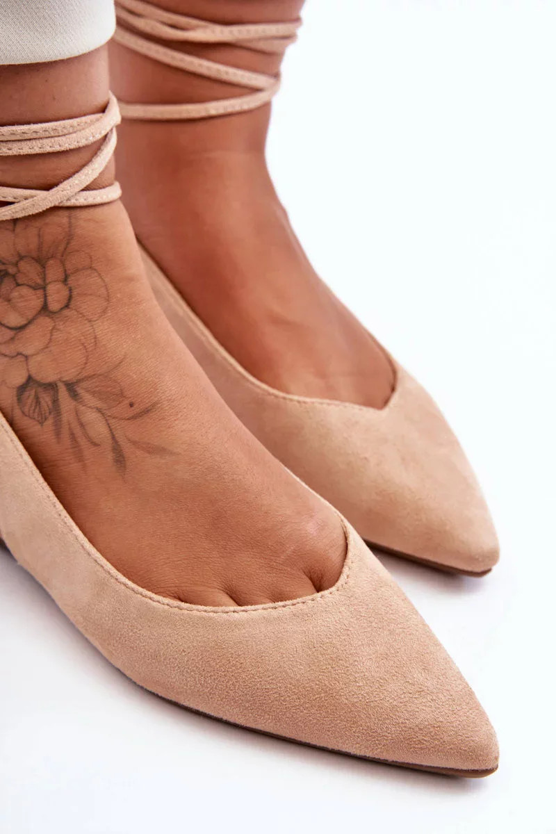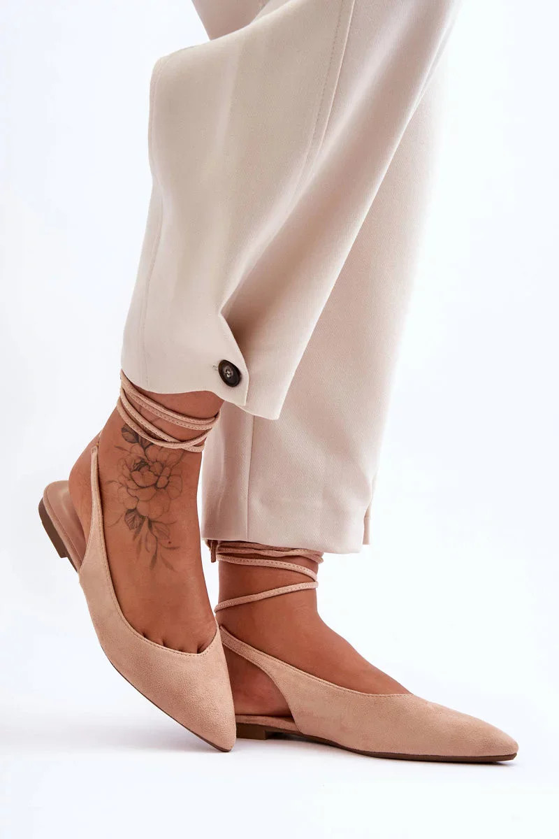 Stylové dámské baleríny mají odhalenou patu a špičatý nos. Byla vyrobena z eko semiše. Baleríny mají tkaničku kolem lýtka. Měkká eko kožená vložka zajistí pohodlí při používání. Baleríny mají plochou patu a protiskluzovou podrážku. Skvělý model pro teplé dny! Při výběru velikosti se řiďte tabulkou velikostí.