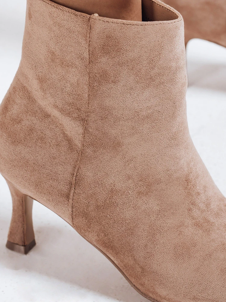 Boty jsou vyrobeny z ekologické semišové kůže příjemné na dotek a mají elegantní tvar s mírně zúženým nosem. Štíhlý podpatek celý vzhled odlehčuje a díky univerzálnímu střihu je obuv vhodná pro mnoho stylizací. Vnitřek je zakončen přikrývkou na boty, která zajistí pohodlí v chladnějších dnech bez nadměrného zahřívání.