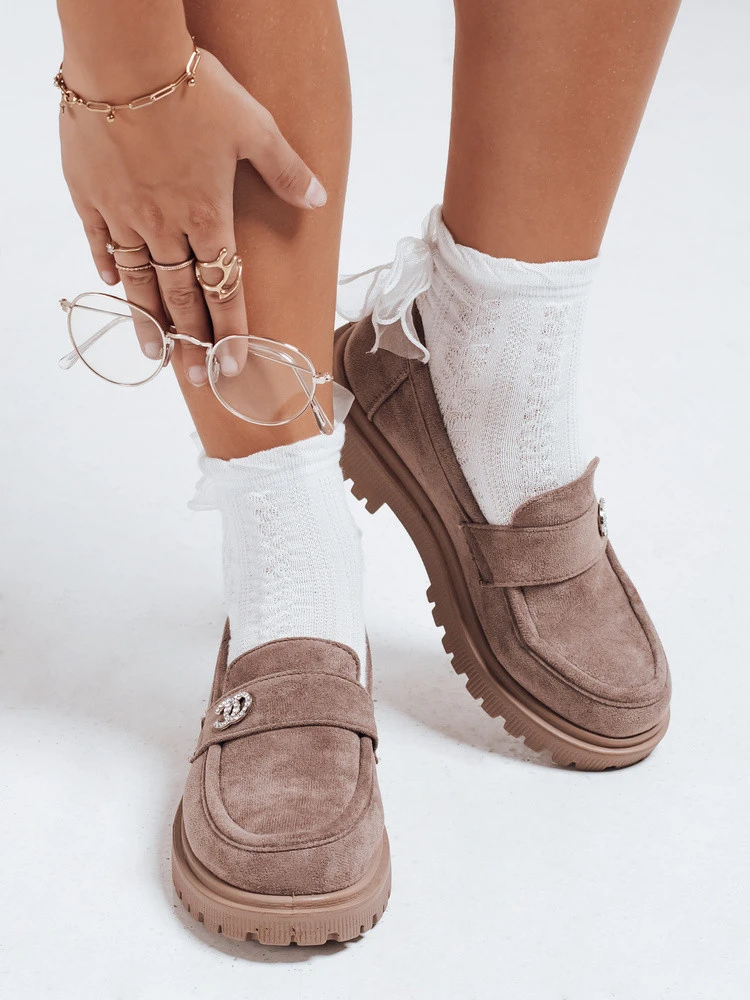 Damskie mokasyny na platformie wykonane z ekologicznej skóry zamszowej to świetny wybór dla kobiet ceniących wygodę i modny wygląd. Model wyróżnia się minimalistycznym fasonem z elegancką ozdobą z przodu, co dodaje mu charakteru. Stabilna podeszwa o wysokości 3 cm zapewnia komfort podczas codziennego użytkowania, a klasyczny design sprawia, że pasują zarówno do stylizacji casualowych, jak i bardziej eleganckich.