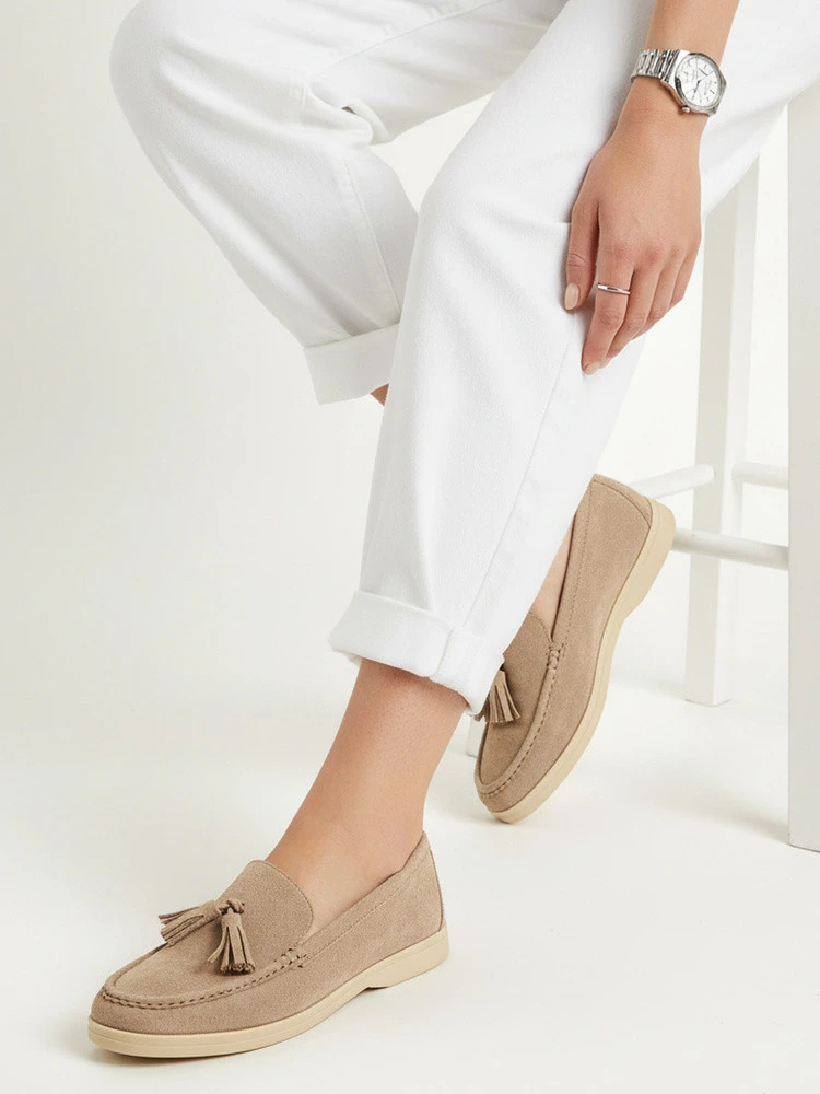 Dámské mokasíny klasického tvaru jsou ideální pro každodenní nošení a elegantní ležérní styling. Díky nazouvacímu provedení se snadno nazouvají a plochá podrážka podporuje pohodlí při chůzi. Ozdobné střapce jim dodávají elegantní charakter, který se hodí k látkovým kalhotám, džínům i cigaretovým kalhotám. Svršek je vyroben z umělého semiše.
