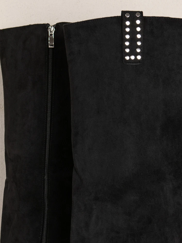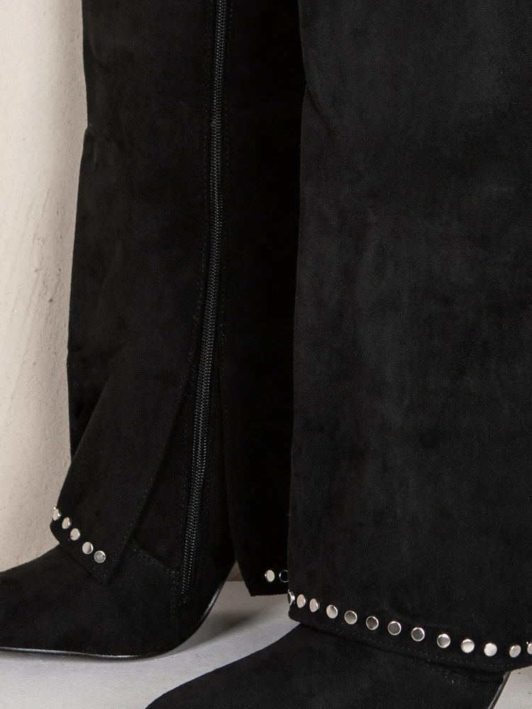Černé kozačky ZY1330 se vyznačují elegantním semišovým svrškem a působivým zdobením stříbrnými nýty. Vysoký stabilní podpatek krásně zeštíhluje siluetu, zatímco měkký organický semiš dodává obuvi stylový nádech. Model má na vnitřní straně praktický zip, díky kterému se snadno nazouvá a dokonale se přizpůsobí lýtku. Zateplený vnitřek poskytuje pohodlí i v chladnějších dnech.