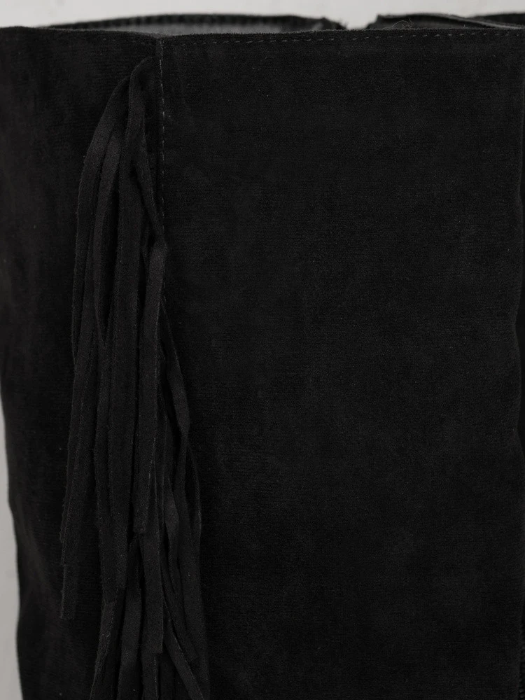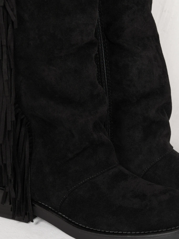 Wysokie kozaki o miękkiej, ekologicznej zamszowej strukturze wyróżniają się efektownymi frędzlami, które dodają sylwetce lekkości. Model łączy wygodę z wyrazistym stylem inspirowanym modą boho. Stabilna podeszwa zapewnia komfort noszenia przez cały dzień, a ocieplenie sprawia, że sprawdzą się również w chłodniejsze dni.