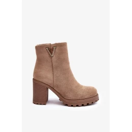 Dámské semišové kotníkové boty na vysokém podpatku se zdobením, béžová model 20031909 - Kesi