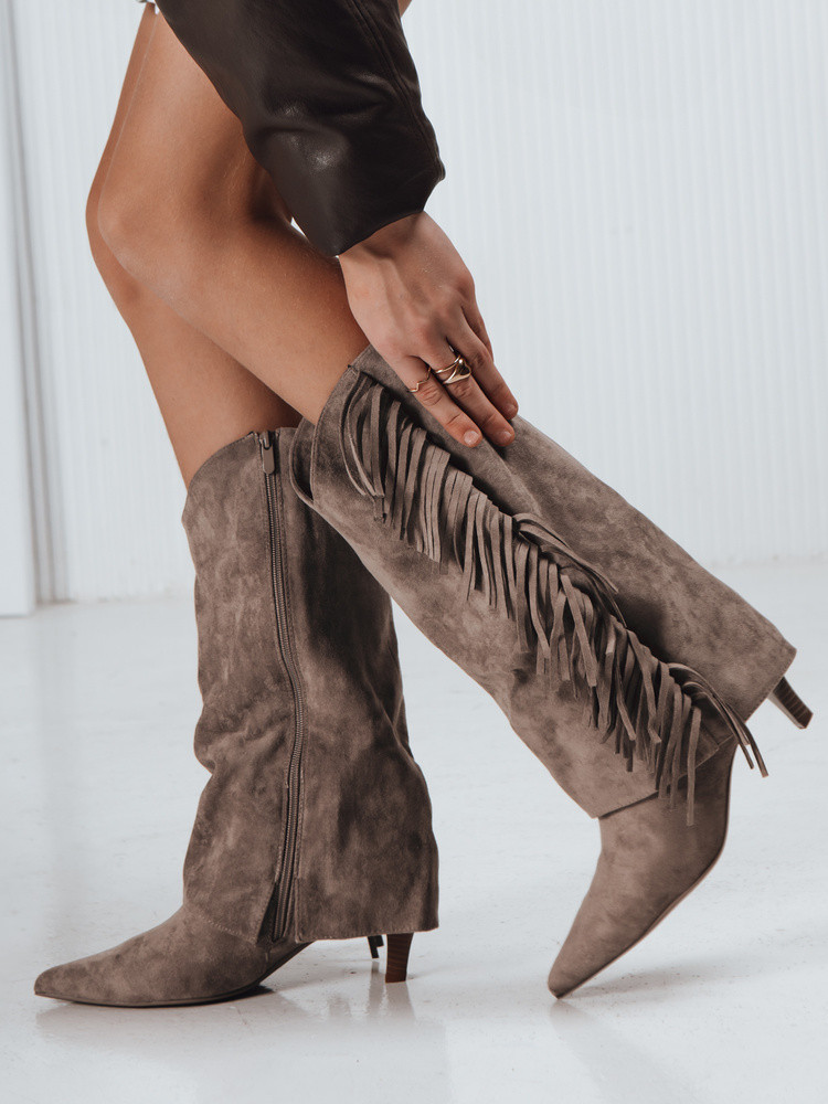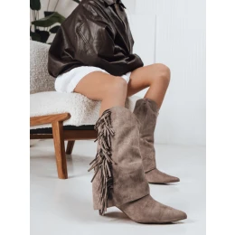 Stylowe kowbojki wykonane z miękkiego zamszu ekologicznego, inspirowane trendem boho z charakterystycznymi frędzlami po bokach. Model z lekko spiczastym noskiem i subtelnym obcasem łączy elegancję z wygodą. Świetnie komponuje się z sukienkami, spódnicami i długimi płaszczami, podkreślając kobiecy styl.