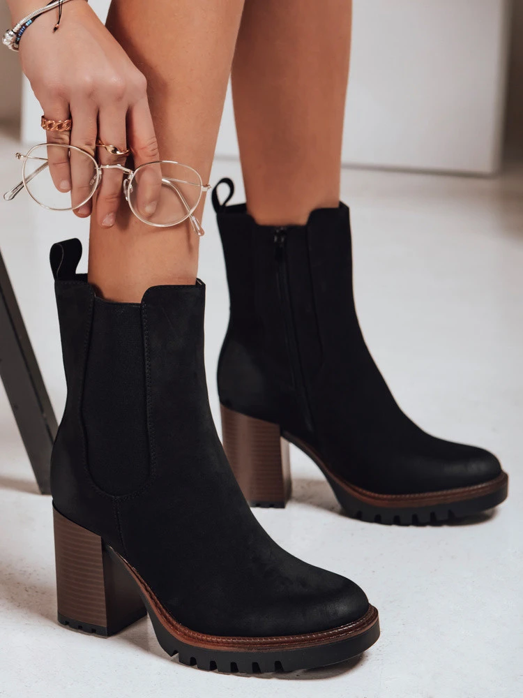 Model wyróżnia się wysokim, stabilnym obcasem oraz cholewką wykonaną z miękkiego zamszu ekologicznego. Krótka forma ułatwia dopasowanie do wielu stylizacji, a zamek wszyty po wewnętrznej stronie poprawia wygodę zakładania. Ocieplenie w postaci koca obuwniczego podnosi komfort noszenia w chłodniejsze dni.
