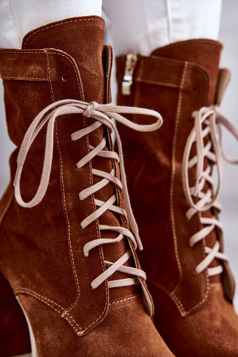 Skvělé dámské kozačky vyrobené z přírodního semiše. Set na platformě a podpatku v podobě sloupku. Podpatek v těchto botách je vyztužený, což umožní správnou stabilizaci nohy. Model se šněrováním a zipem na boku svršku. Pohodlná, měkká stélka z přírodní kůže zajistí pohodlí při používání. Při výběru velikosti použijte tabulku velikostí.