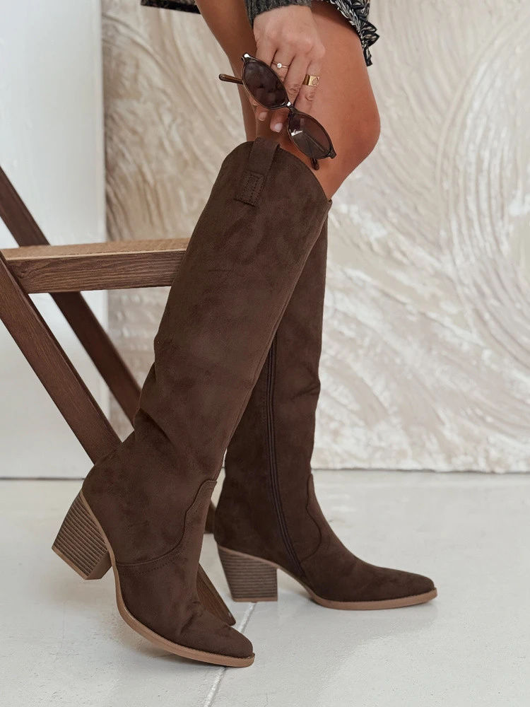Dámské semišové kozačky na podpatku hnědé Dstreet ZY1062