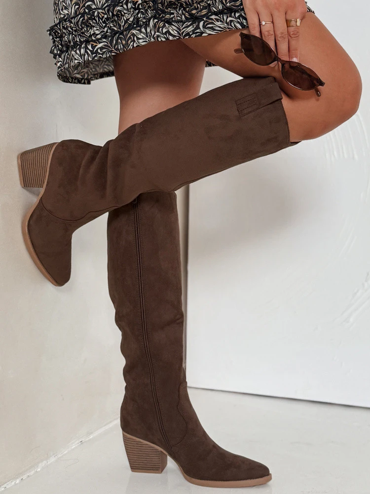Dámské kozačky z ekologického semiše jsou dokonalou kombinací klasiky a pohodlí. Model v délce ke kolenům byl usazen na stabilním jehlovém podpatku, který dodává siluetě lehkost a zároveň poskytuje pohodlí při chůzi. Jemné prošívání a štíhlý tvar nosu jim dodávají elegantní charakter, který se skvěle hodí jak pro každodenní, tak i stylovější komplety.