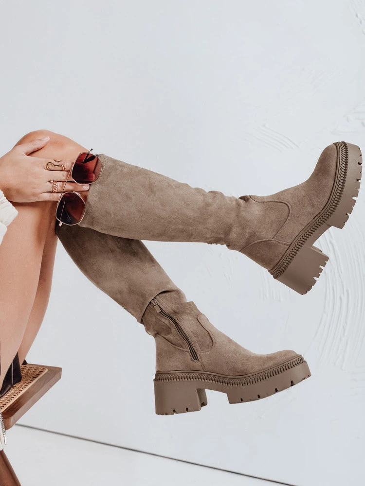 Dámské kozačky na masivní platformě z ekologické semišové kůže jsou kombinací stylu a pohodlí. Vysoký svršek sahající ke kolenům zvýrazňuje nohy, zatímco stabilní 6cm podpatek dodává siluetě štíhlost. Praktický boční zip usnadňuje obouvání a zouvání kozaček.