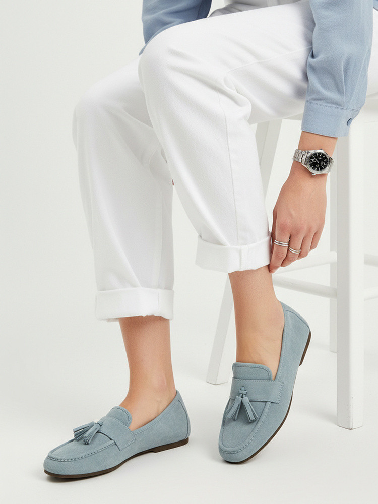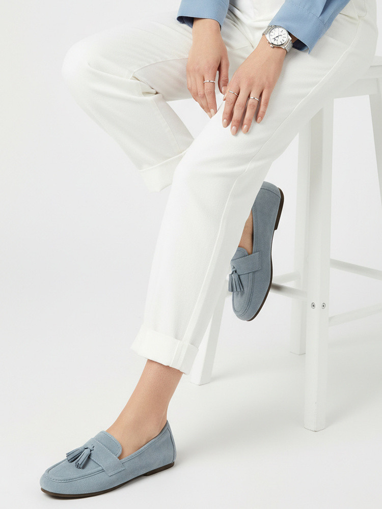 Mokasyny damskie o klasycznej formie sprawdzają się w codziennym użytkowaniu oraz stylizacjach smart casual. Wsuwany fason ułatwia szybkie zakładanie, a niski obcas sprzyja wygodzie podczas chodzenia. Ozdobne frędzle nadają im eleganckiego charakteru i podkreślają ponadczasowy styl. Miękka cholewka została wykonana ze sztucznego zamszu.