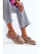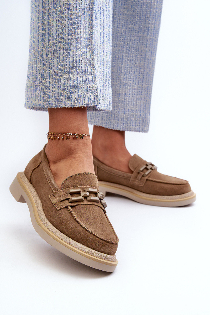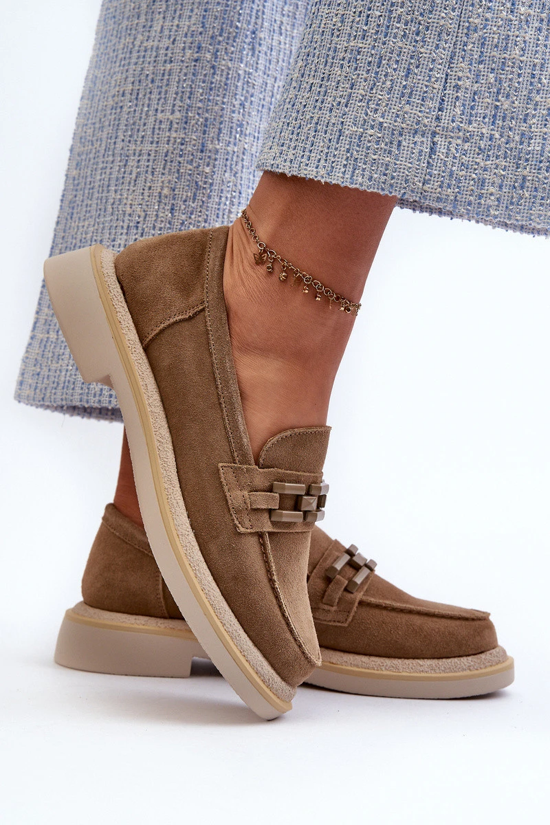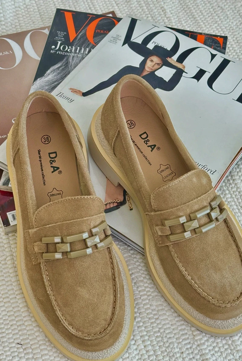 Dámské mokasíny vyrobené z přírodního semiše. Plochý podpatek zaručuje stabilitu a pohodlí při chůzi. Další ozdobný prvek vpředu jim dodává originalitu, což je činí nejen praktickými, ale také módními. Tyto mokasíny budou ideálním doplňkem k mnoha různým stylizacím, jak ležérním, tak i elegantnějším. Při výběru velikosti se řiďte tabulkou velikostí.