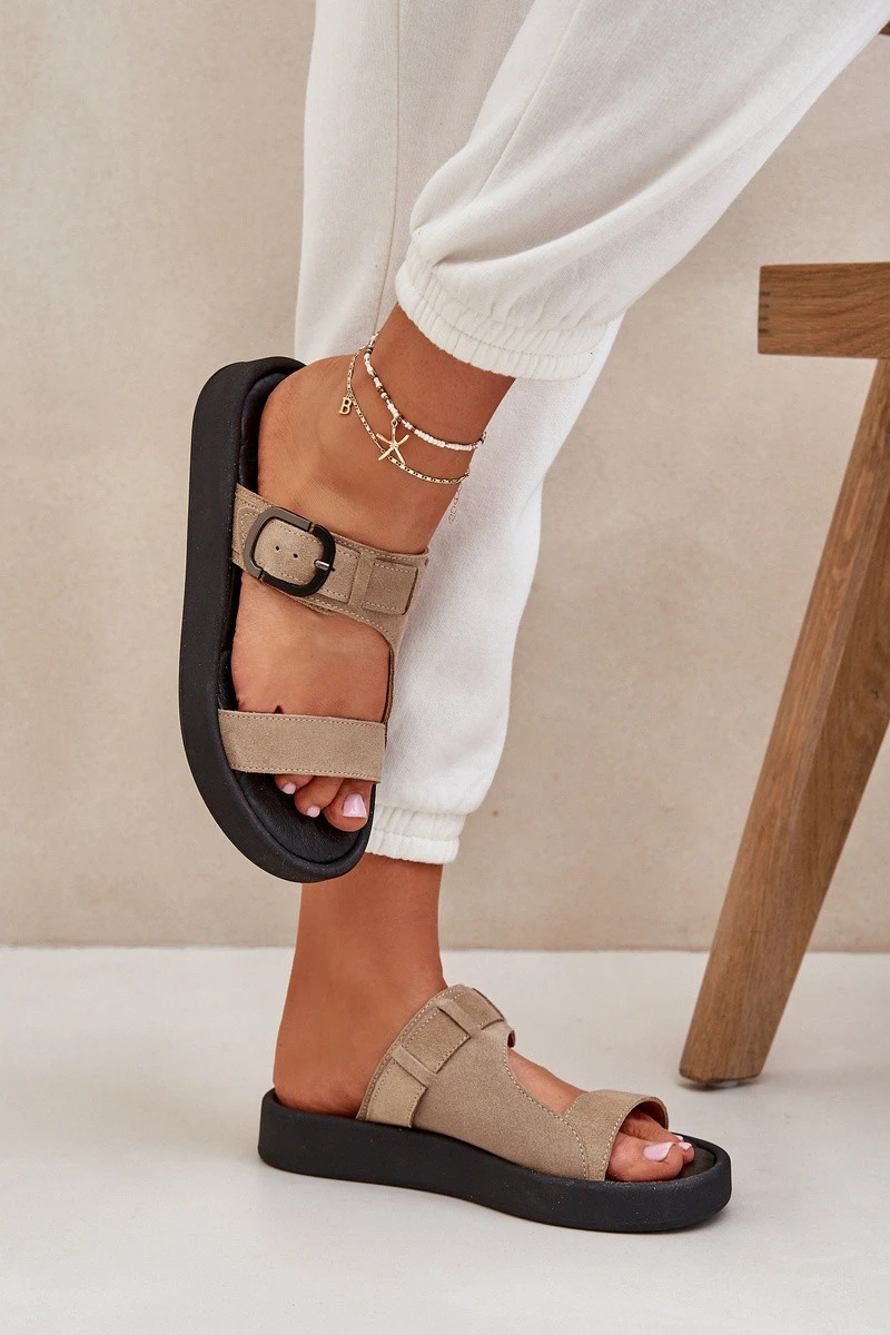 Dámské pantofle vyrobené z přírodní semišové kůže. Umístěné na platformě. Ideální na letní dny, tyto pantofle skvěle doplní každý outfit, kombinují módní vzhled s praktičností. Pásek s přezkou zajišťuje dodatečné nastavení a měkká kožená stélka zaručuje pohodlí při nošení. Při výběru velikosti se řiďte tabulkou velikostí.
