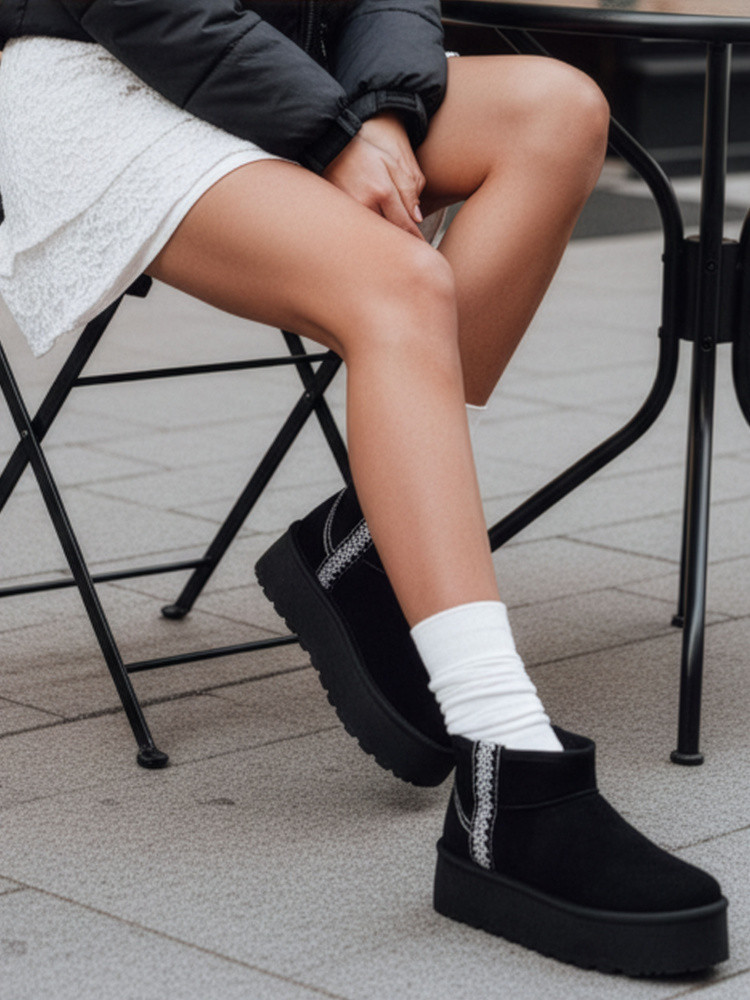 Model wykonany z miękkiego zamszu ekologicznego łączy modny wygląd z wysokim komfortem użytkowania. Delikatne przeszycia i ozdobna lamówka nadają mu charakteru, a miękkie futerko wewnątrz zapewnia ciepło w chłodne dni. Wsuwana konstrukcja ułatwia zakładanie i dobrze dopasowuje się do stopy.
