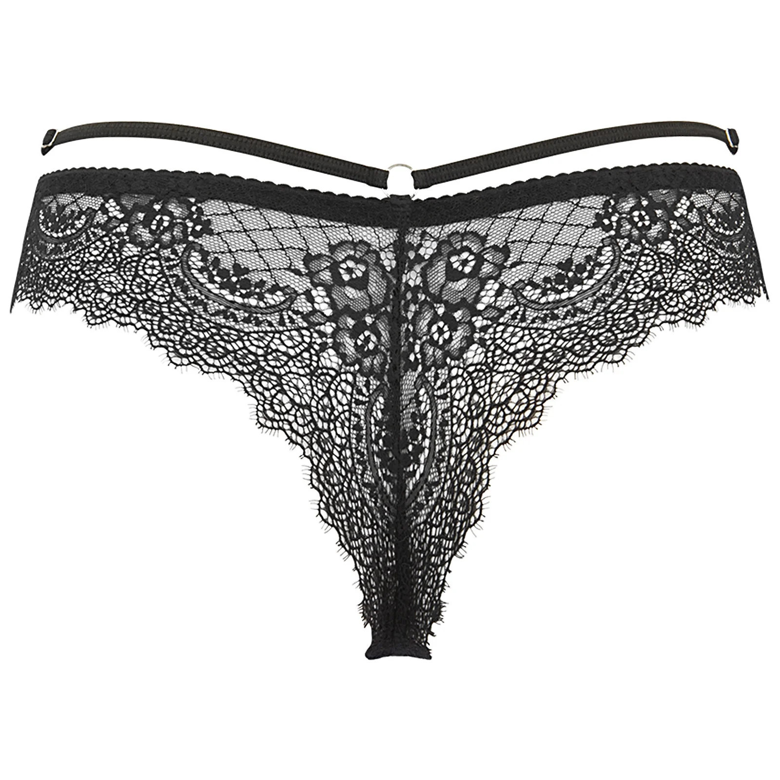 Jemná krajková tanga, která se nosí s podprsenkou V-10091, snadno zvýrazní linii vašich boků a zaoblení hýždí. Nad tanga je přidán ozdobný pásek zdobený stříbrnými regulátory a upevněný neodnímatelnými kroužky. Má široký bavlněný klín, takže se pohodlně nosí po celý den.