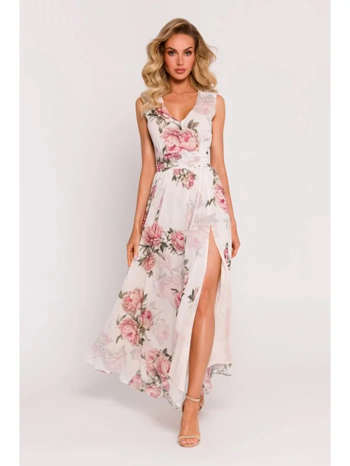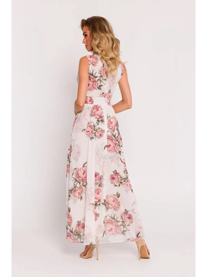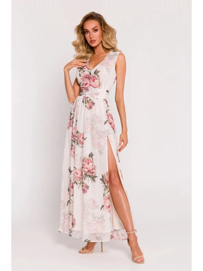 Produkt Dámské šifonové šaty M781 model 2 Ecru s květy - MOE prodáváme v těchto velikostech: Sa barvách ecru s květy5905563725887