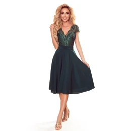 Dámské šifonové šaty v lahvově zelené barvě s krajkovým výstřihem model 17434087 - numoco