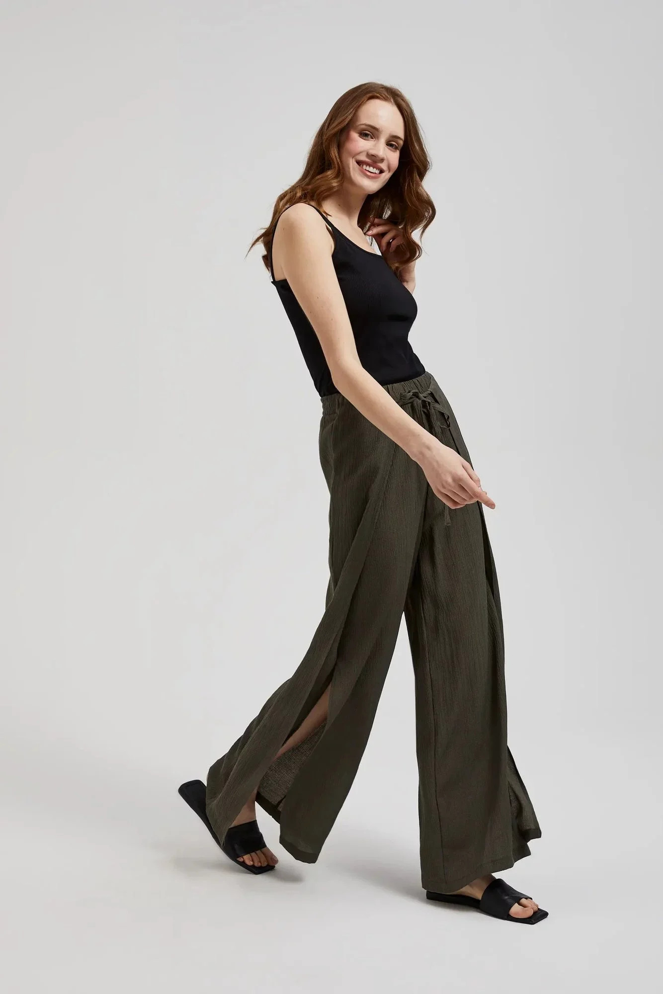 Tyto jedinečné dámské kalhoty kombinují pohodlí a styl. Jsou vyrobeny ze 100% viskózy, což je činí lehkými, vzdušnými a dokonale přizpůsobitelnými postavě. Široké nohavice dodávají elegantní, splývavý vzhled, který se hodí jak na každodenní nošení, tak pro výjimečné příležitosti. Díky elastické gumě v pase poskytují pohodlí a volnost pohybu. Můžete je kombinovat s elegantní halenkou nebo volným tričkem – vždy budou vypadat módně! Velikost je univerzální a vhodná pro ženy ve velikostech S, M nebo L.
