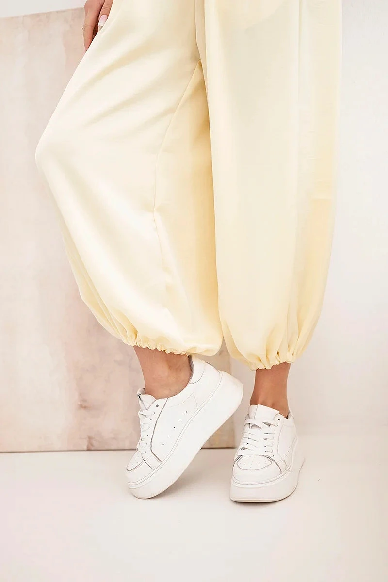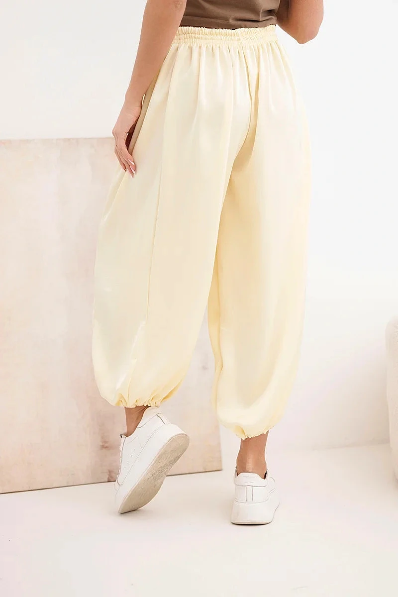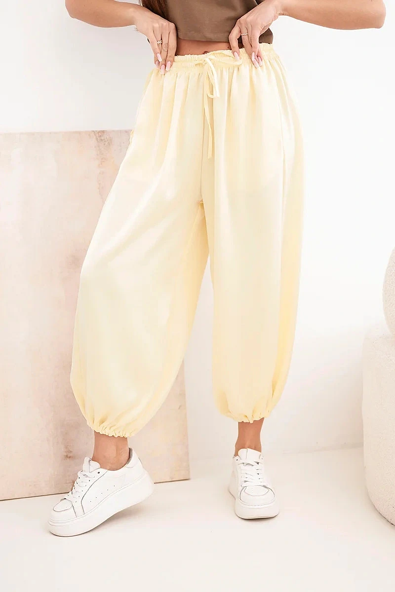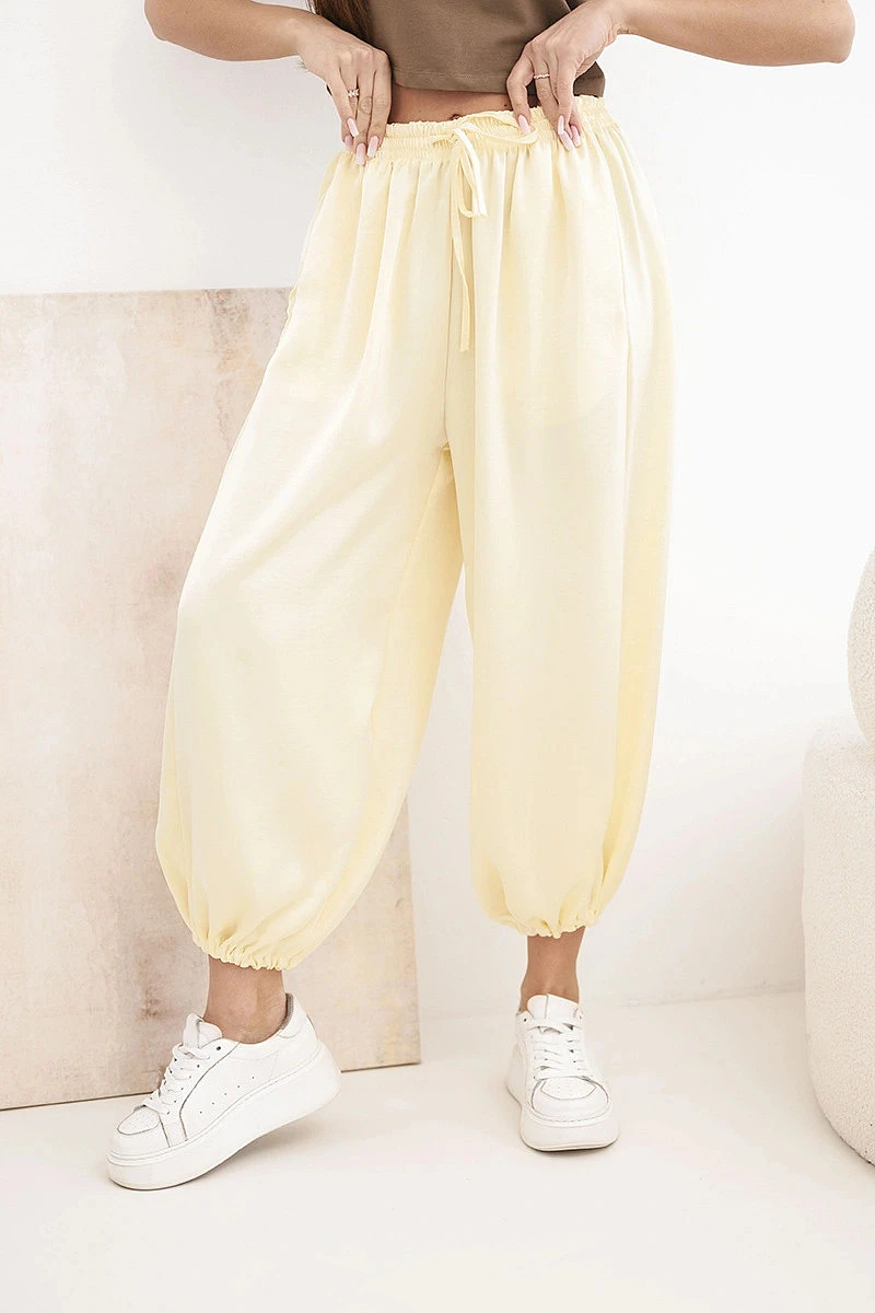 Dámské široké kalhoty s gumou v pase a zavazováním ve stylu model 22064411 žluté - K-Fashion