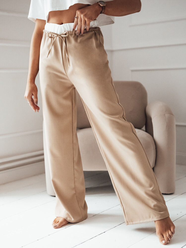 Módní kalhoty s širokými nohavicemi z látky jsou nezbytnou součástí stylizace pro tuto sezónu, mají dvě kapsy, vyšší náplet, zavazování a ozdobný elastický pás, jsou vhodné pro všechny typy postavy a jsou k dispozici ve čtyřech barvách.