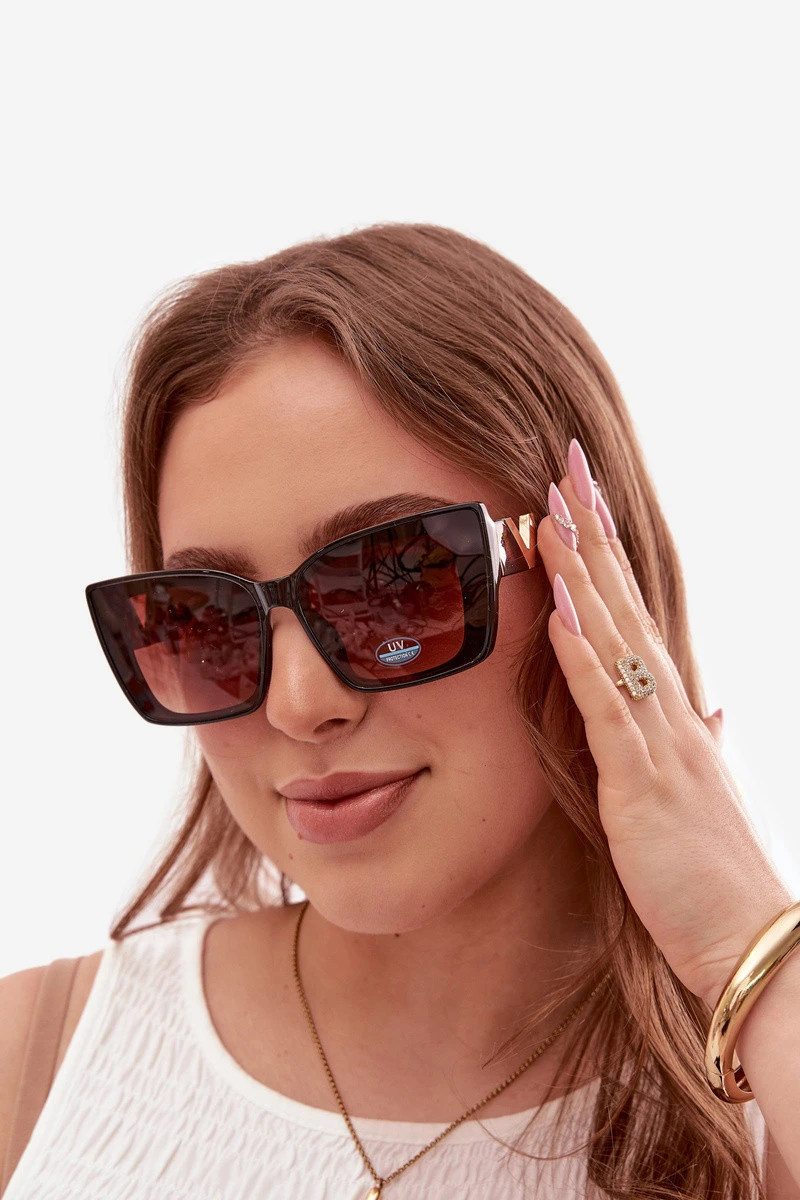 Dámské sluneční brýle typu kočičí oko jsou stylovým doplňkem, který zdůrazňuje ženský charakter každého outfitu. Vyrobené s UV filtrem, účinně chrání oči před škodlivým slunečním zářením. Model se vyznačuje zlatým detailem ve tvaru písmena „V“ umístěným na stranách, který dodává celku šmrnc a moderní akcent. Ideální volba pro ženy, které ocení módní vzhled spojený s funkčností.