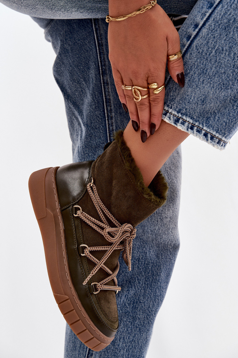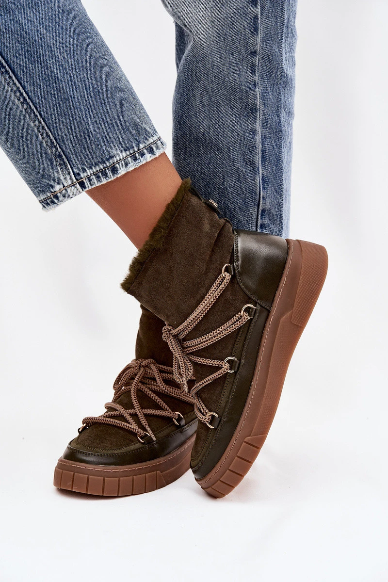Dámské sněhule vyrobené ze směsi eko semiše a eko kůže. Model na platformě zajišťuje stabilitu a vynikající izolaci od podlahy a měkké kožešinové vnitřní části zajišťuje teplo a pohodlí i v mrazivém počasí. Boty jsou nazouvací, což usnadňuje obouvání, a přední šněrování umožňuje lepší přizpůsobení noze a je módním ozdobným prvkem. Tyto sněhule se skvěle hodí pro každodenní zimní stylizace, spojují funkčnost s módním městským stylem. Při výběru velikosti prosím řiďte se tabulkou velikostí. Při výběru velikosti se řiďte tabulkou velikostí.EAN čárové kódy zboží jsou:
