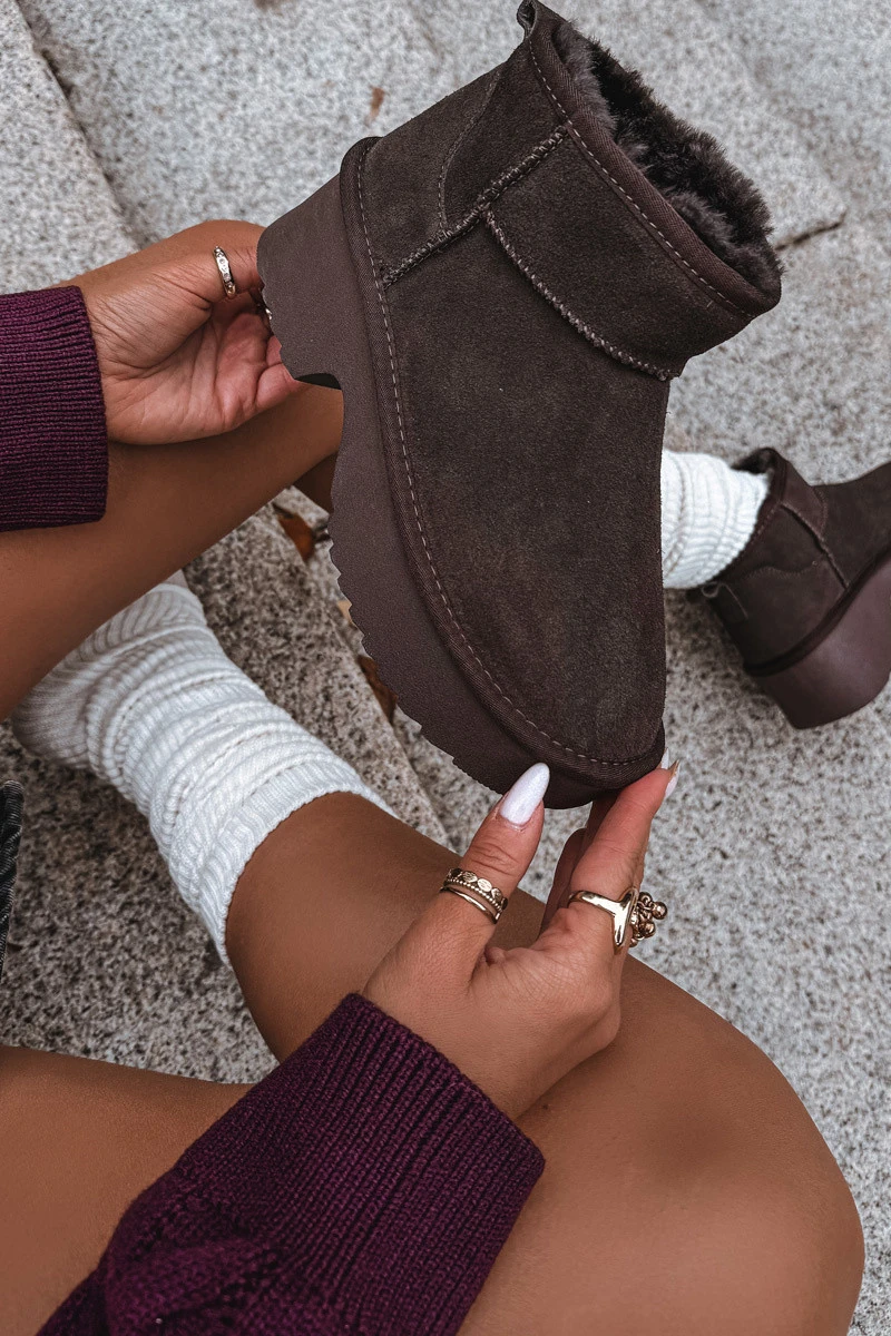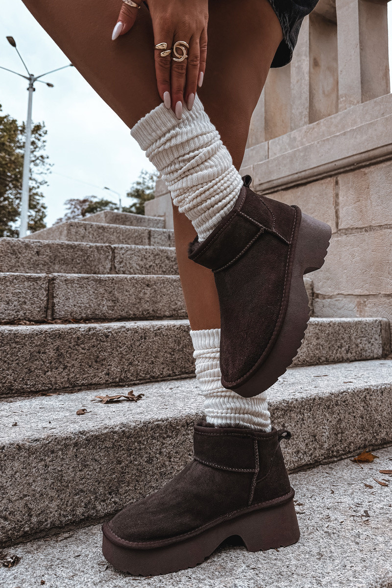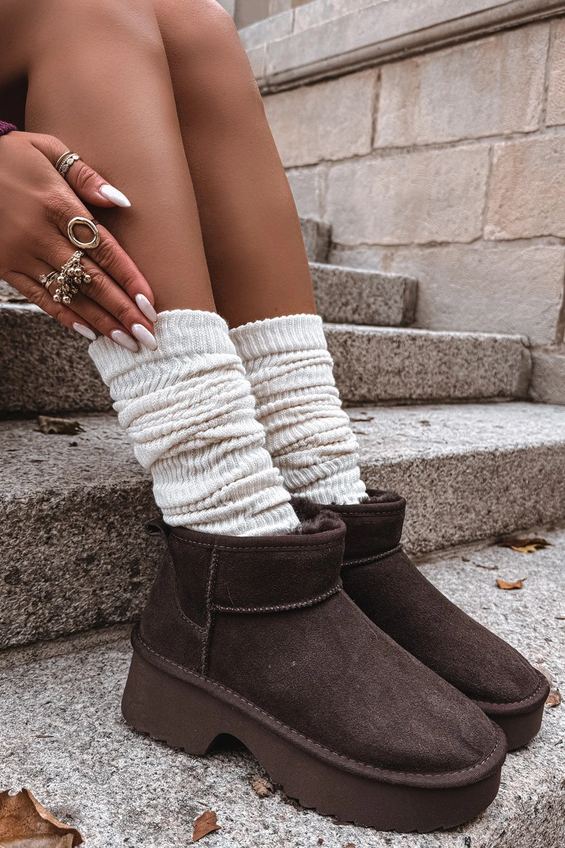 Dámské zimní boty vyrobené z přírodního semiše jsou stylovým návrhem na zimní dny. Umístěné na platformě, poskytují stabilitu a pohodlí při chůzi a zároveň účinně izolují od chladu. Vnitřek bot byl vyhřátý kožešinou, která zaručuje teplo a pohodlí v mrazivých dnech. Módní střih dělá z nich skvělý doplněk aktuálních trendů. Ideální volba pro ženy, které si cení stylu a pohodlí v zimních outfitech. Při výběru velikosti se řiďte tabulkou velikostí.