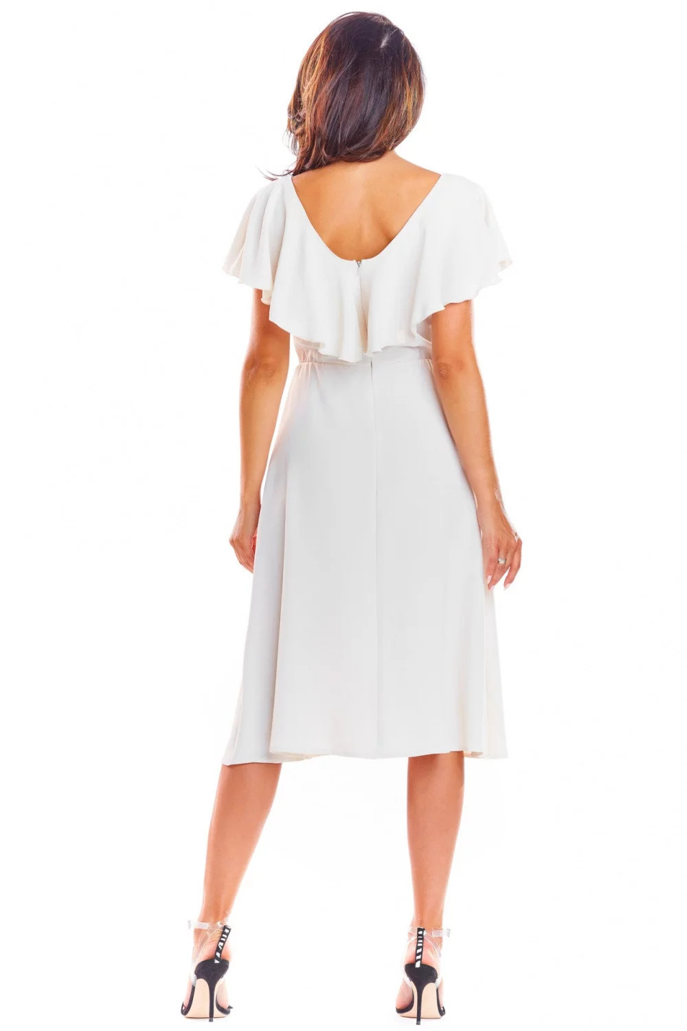 Mimořádně elegantní a ženské midi šaty. Výstřih je zdobený volánkem, který decentně zakrývá ramena. V pase má všitou gumu, díky které se přizpůsobí postavě. Šaty jsou vyrobeny ze splývavé látky, díky které krásně padnou. Zapínání na zádech na krytý zip. Letní jehlové podpatky se k němu skvěle hodí. Výrobek vyrobený v Polsku.