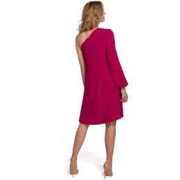Šaty na jedno rameno s nápadnými bufetovými rukávy. Díky volnému, rozšířenému střihu se budete cítit lehce a šaty se budou krásně pohybovat. Skvěle se hodí k botám, jehlovým podpatkům nebo i lodičkám. Šaty se zapínají na krytý zip.