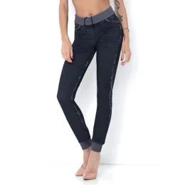 Dámské sportovní bezešvé jeansy se šňůrkou v pase a ve spodní části nohavic zakončeny manžetou. Vyrobeny jsou z jemného elastického materiálu, který se dokonale přizpůsobí tělu. Technologie, kterou byly tyto jeansy vytvořeny je použitelná pouze pro bezešvé výrobky. Speciální design na zadní straně vytváří přirozený efekt zdola nahoru - zvedne a vylepší hýždě. Velmi dobrá pevnost a odolnost proti praní.