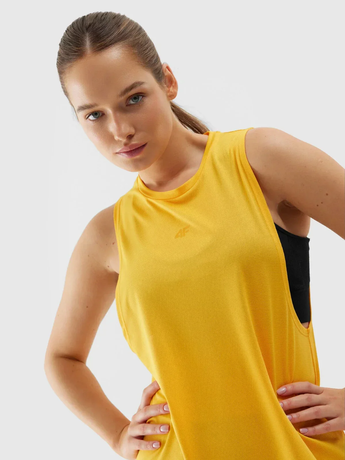 Kulatý výstřih. Perforovaná a lehká pletenina podporuje ventilaci během cvičení. Široké průramky. Mírně prodloužená zadní strana.