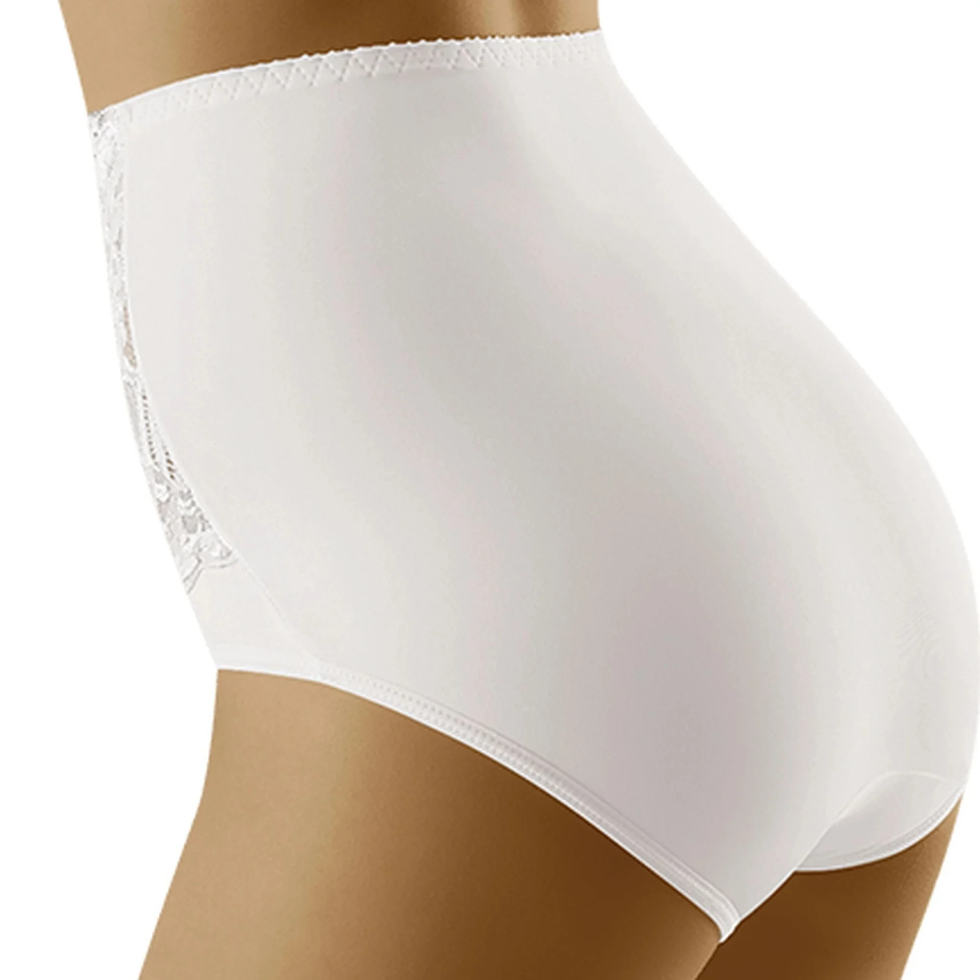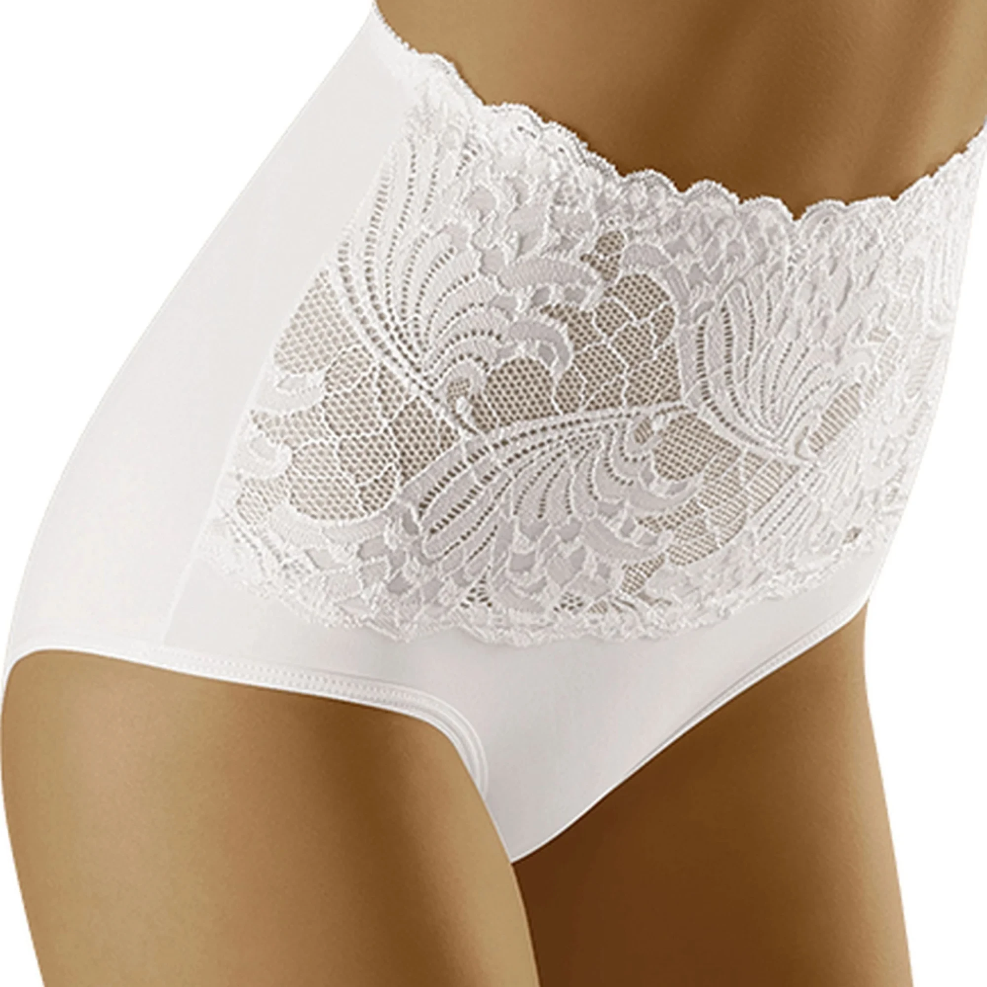 Dámské stahovací kalhotky Kaja white Wol-bar - bílá barva - z kvalitního mikrovlákna s tvarovacím efektem - vyšší pas - přední část z ažurové krajky - zadní část je hladká
