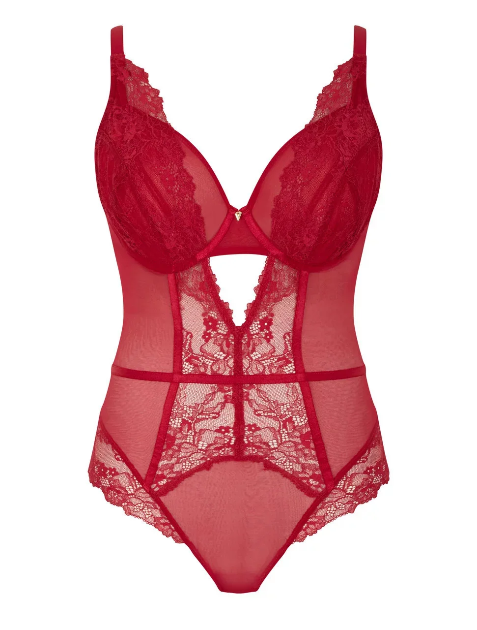 Body Cleo by Panache SELENA 10625 Bodysuit Ruby Red. Červené body s kosticemi, hluboký střih.