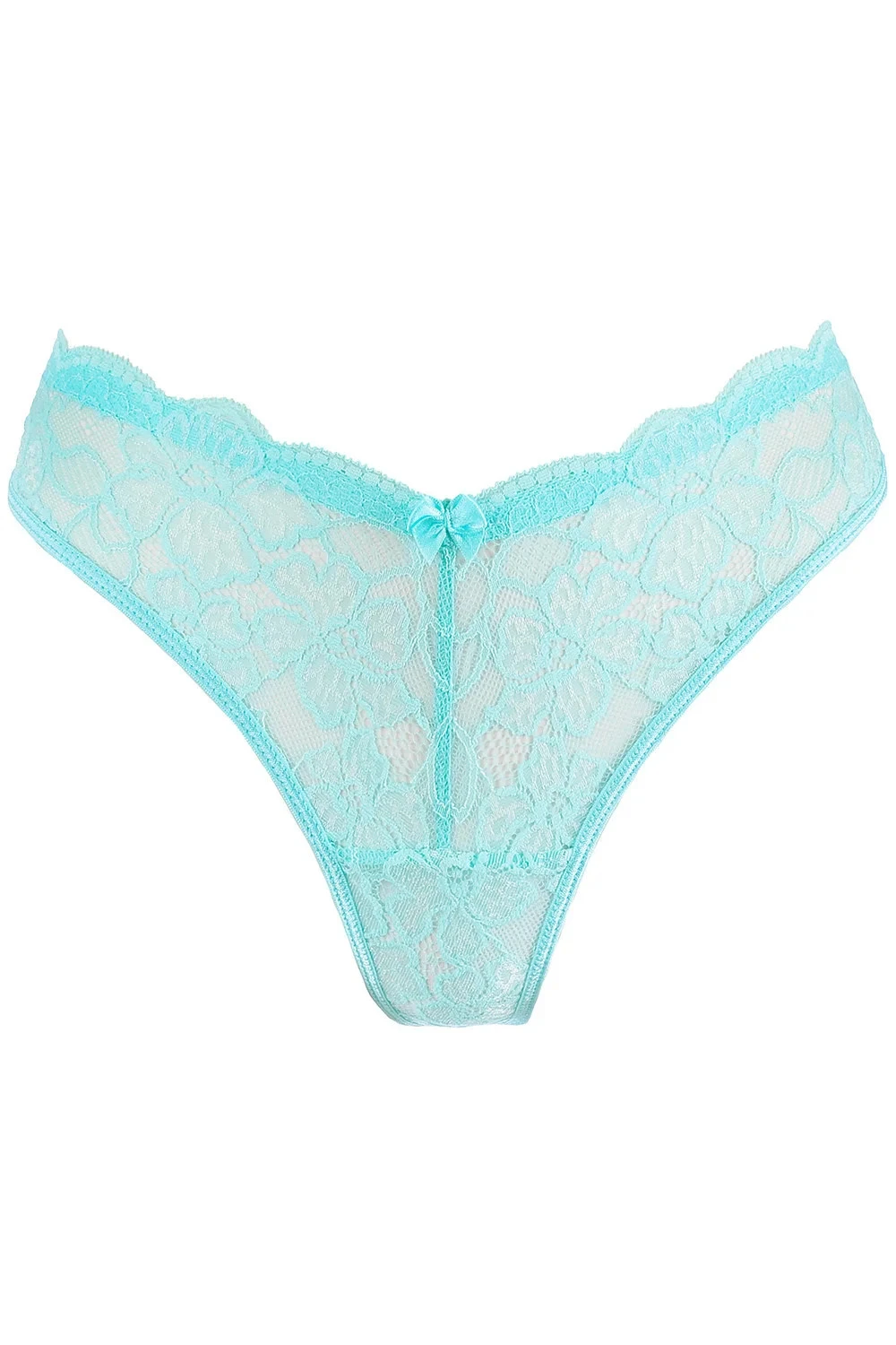 Neobvyklá kombinace nevinné modré krajky a odvážného, vykrojeného střihu. Půvab dodává malá mašlička. Použití bavlněné stélky zaručuje nejvyšší pohodlí