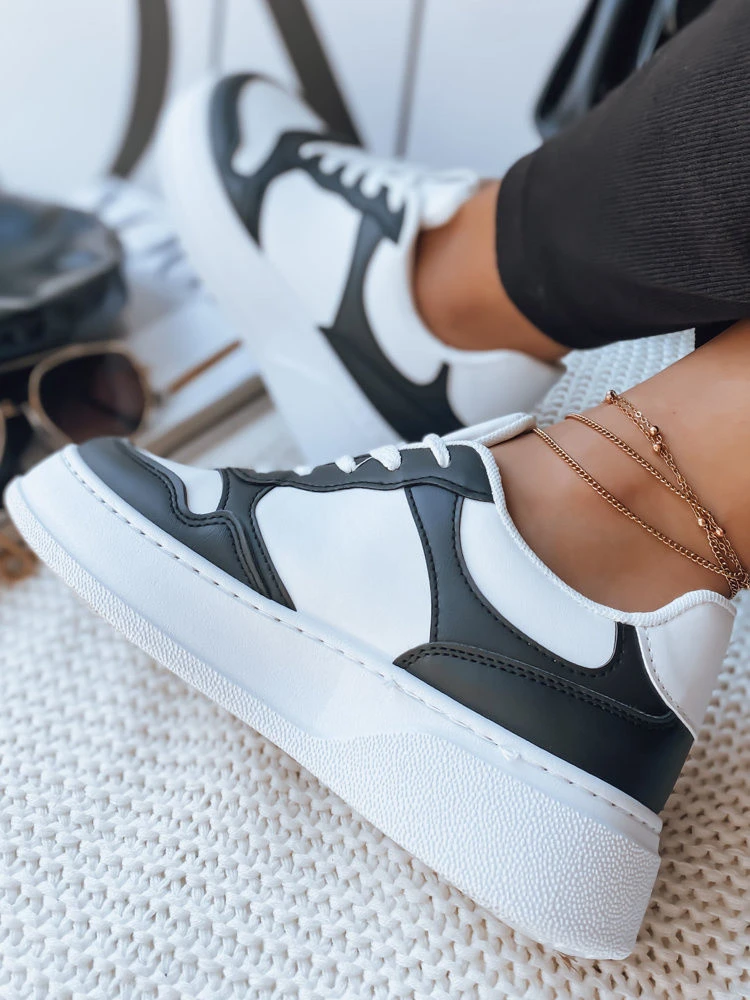 Stylové dámské tenisky se zaoblenou špičkou a mírně zvýšenou podrážkou. Model se skvěle hodí ke sportovním i elegantním outfitům. Díky tlumené barevné kombinaci se hodí ke každému stylu.