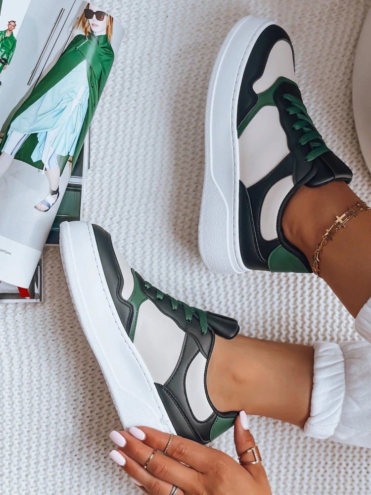 Stylové dámské tenisky se zaoblenou špičkou a mírně zvýšenou podrážkou. Model se skvěle hodí ke sportovním i elegantním outfitům. Díky tlumené barevné kombinaci se hodí ke každému stylu.