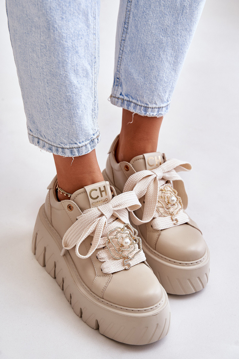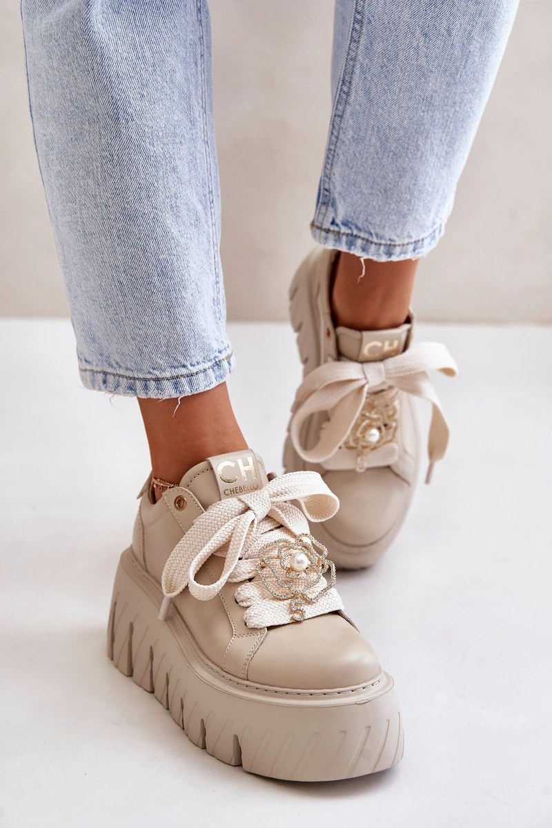Tenisky od značky CheBello jsou ideální kombinací stylu a pohodlí. Vyrobené z vysoce kvalitní přírodní kůže, tyto boty zajišťují trvanlivost a komfort nošení po celý den. Model je usazen na masivní platformě, která nejen přidává několik centimetrů na výšce, ale také zaručuje vynikající odpružení při každém kroku. Klasické šněrování je obohaceno o zlatou, okouzlující ozdobu, která dodává elegantní charakter. Tyto módní boty dokonale doplní jak ležérní, tak i sofistikovanější stylizace a dodají jim jedinečné kouzlo. Při výběru velikosti se řiďte tabulkou velikostí.