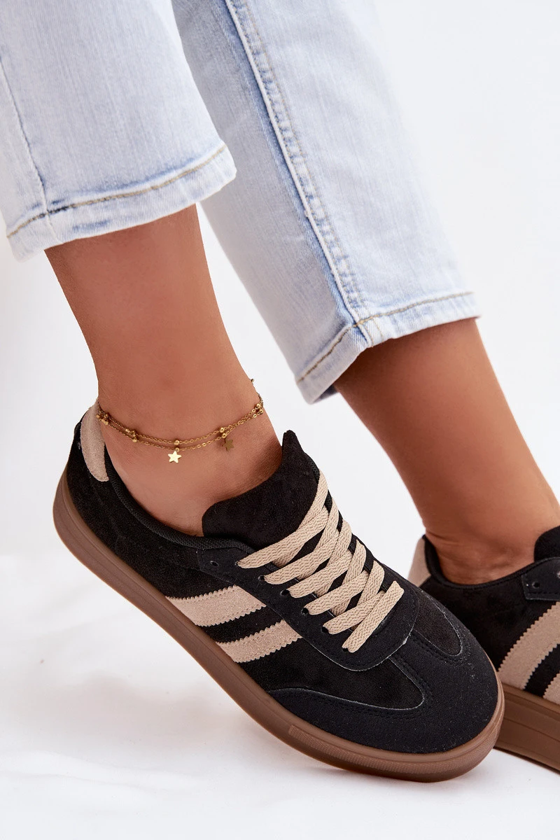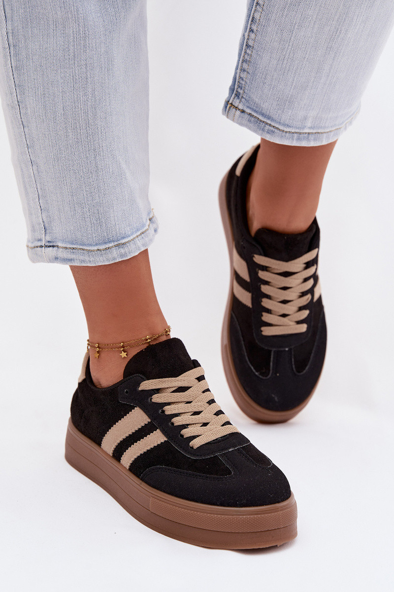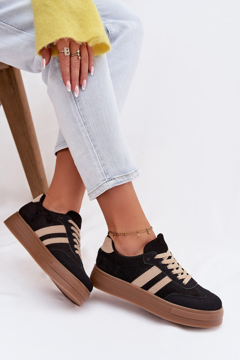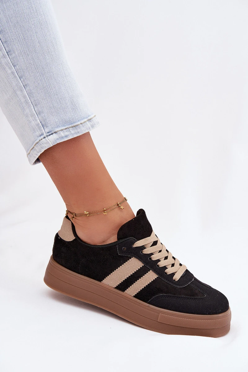 Stylové dámské tenisky z eko semiše jsou spojení módního vzhledu a pohodlí na každý den. Model na platformě jemně zvýrazňuje siluetu a zároveň zajišťuje stabilitu a pohodlí při nošení. Po stranách jsou dva ozdobné pásky, které dodávají sportovně-městský vzhled. Měkká vložka z pěny, navíc potažená materiálem, zaručuje pohodlí i při dlouhodobém nošení. Tyto tenisky jsou skvělé pro každodenní stylizace. Při výběru velikosti se řiďte tabulkou velikostí.