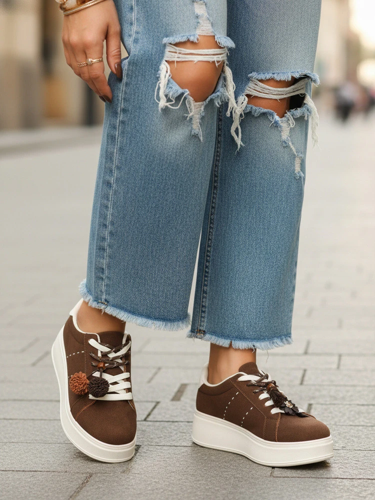 Dámské tenisky z eko-semiše, usazené na zvýšené podrážce se sportovním charakterem. Šněrovací zapínání umožňuje přizpůsobit se noze a ozdobné detaily na tkaničkách dodávají celku ležérní styl. Model určený pro každodenní pohodlí.