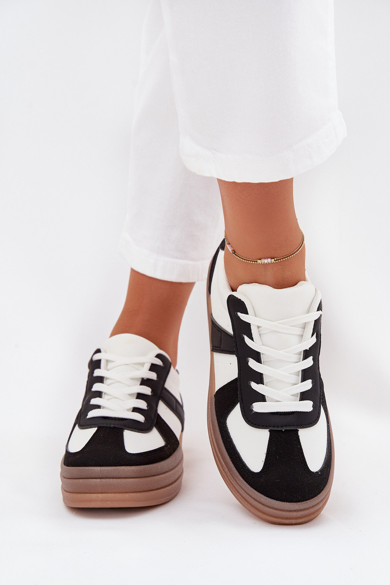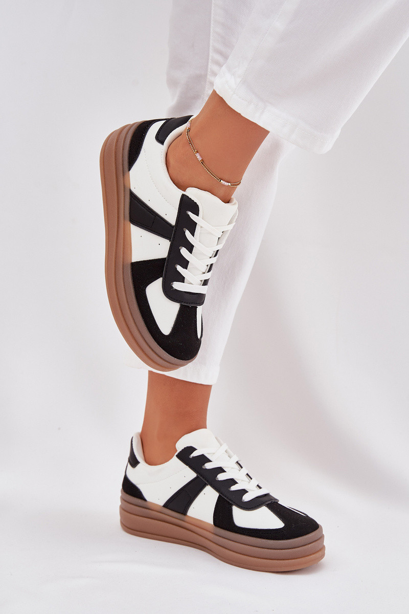 Módní sneakersy z eko kůže jsou kombinací stylu a pohodlí. Usazené na platformě dodávají lehkost a výšku, zajišťují pohodlí během každodenních aktivit. Vyjímatelná pěnová stélka, navíc potažená materiálem, zaručuje měkkost a odpovídající podporu pro nohu po celý den. Ideální pro každodenní stylizace. Při výběru velikosti se řiďte tabulkou velikostí.
