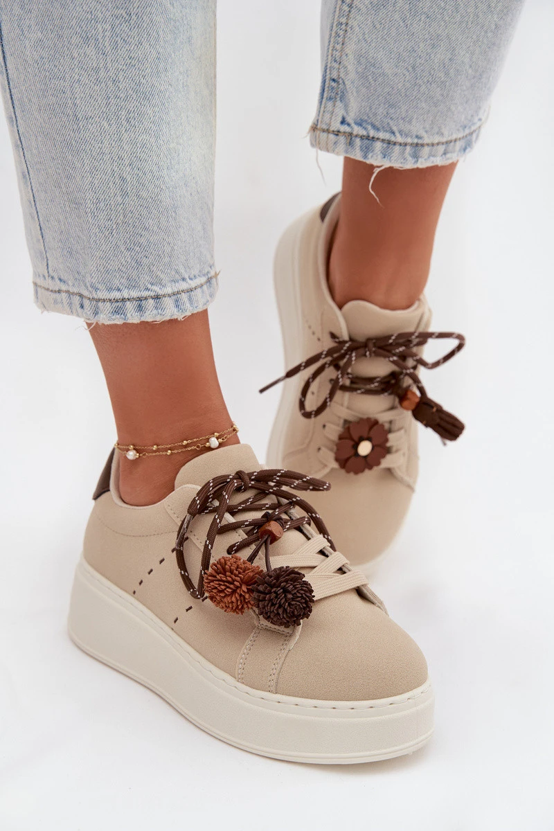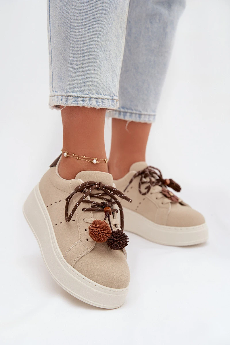 Módní dámské tenisky z ekologické semiše jsou ideální kombinací pohodlí a stylu. Model na platformě jemně pozvedá postavu a zároveň zajišťuje pohodlí při chůzi. Dekorativní pompony na šněrování dodávají celku dívčí šarm a odlišují boty od klasických tenisek. Vložka z pěny, navíc potažená měkkým materiálem, zaručuje pohodlí i při dlouhodobém nošení. Skvělá volba pro každodenní městské outfity. Při výběru velikosti se řiďte tabulkou velikostí.