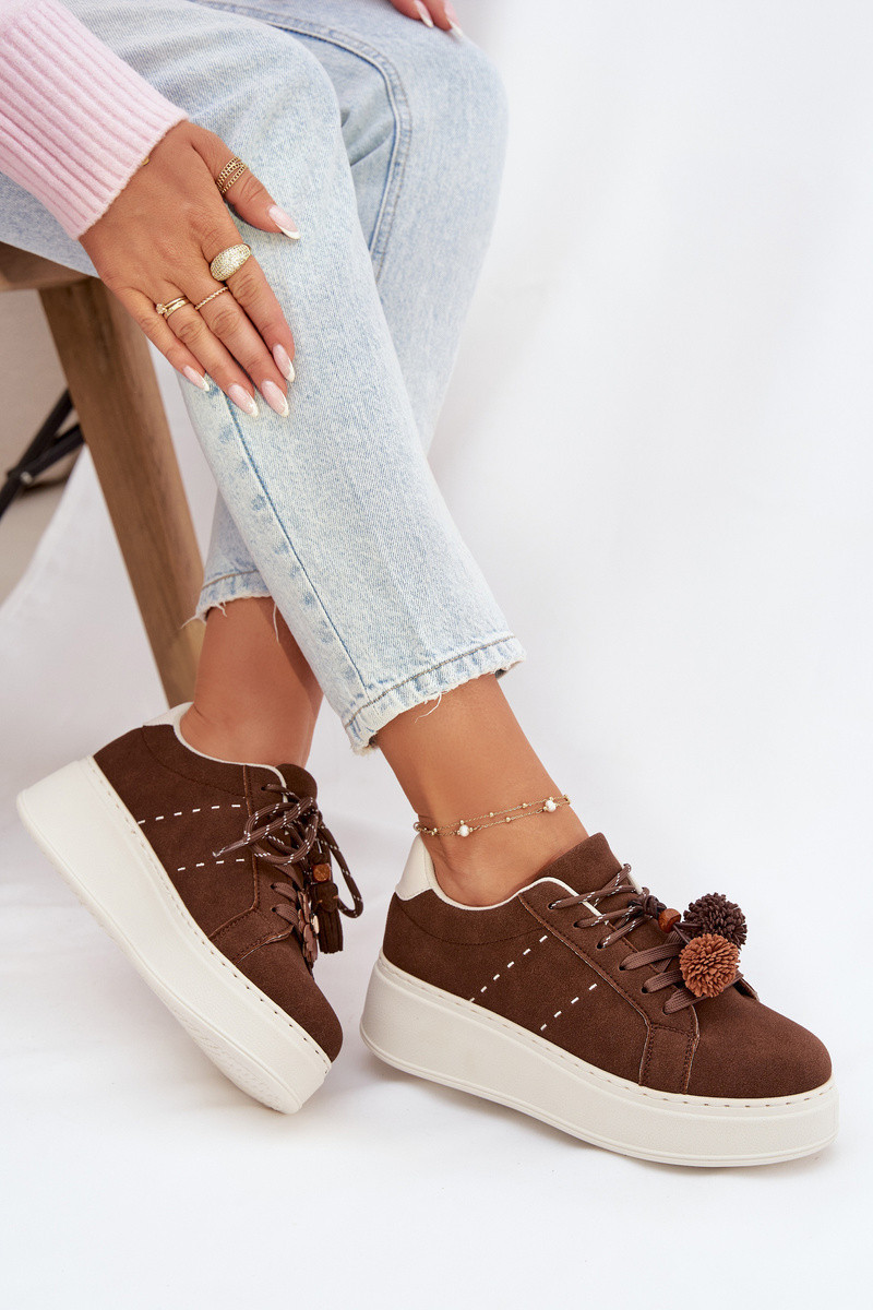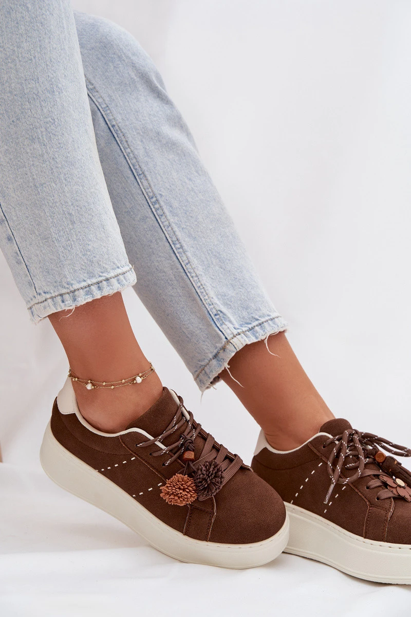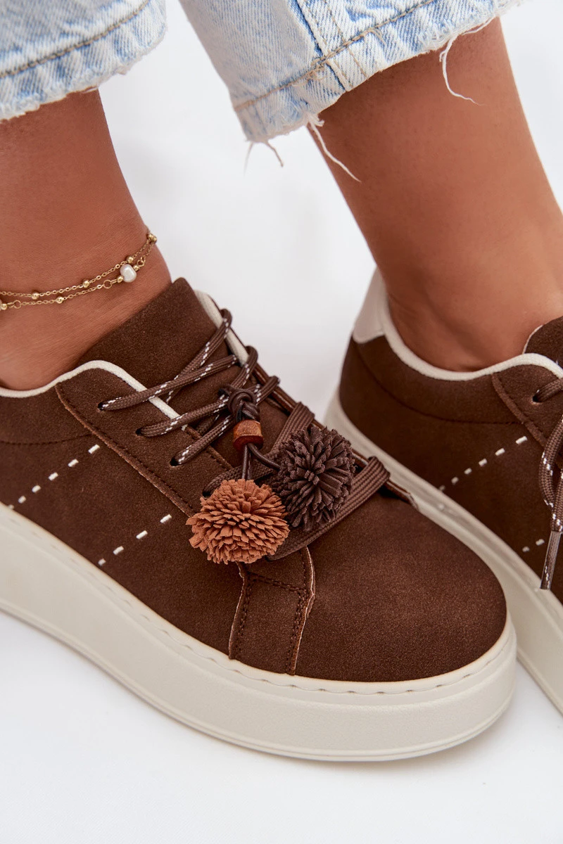 Módní dámské tenisky z ekologické semiše jsou ideální kombinací pohodlí a stylu. Model na platformě jemně pozvedá postavu a zároveň zajišťuje pohodlí při chůzi. Dekorativní pompony na šněrování dodávají celku dívčí šarm a odlišují boty od klasických tenisek. Vložka z pěny, navíc potažená měkkým materiálem, zaručuje pohodlí i při dlouhodobém nošení. Skvělá volba pro každodenní městské outfity. Při výběru velikosti se řiďte tabulkou velikostí.