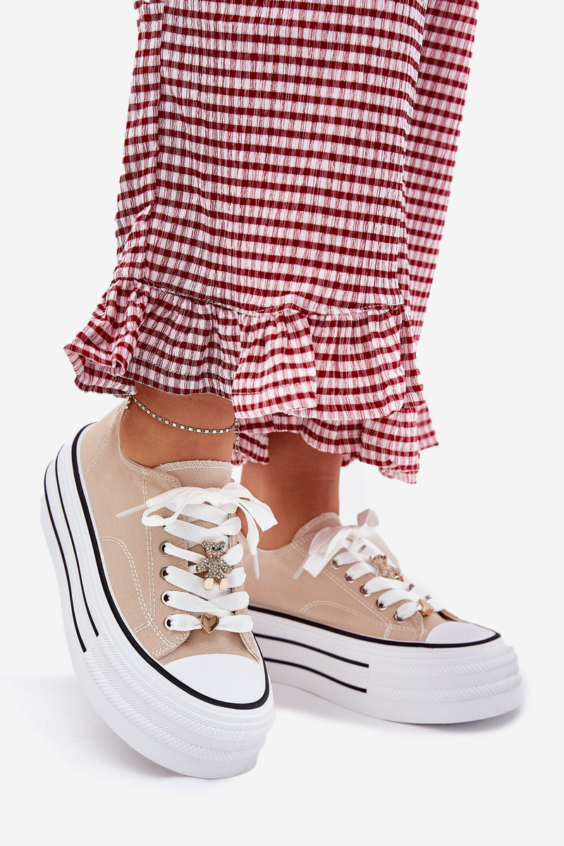 Dámské tenisky z textilního materiálu usazené na masivní platformě jsou módní návrh pro každý den. Šněrovací, s dalšími zlatými přívěsky, které jim dodávají stylový akcent. Ideální pro každodenní stylizace, spojují pohodlí s moderním vzhledem, skvěle se hodí jak k kalhotám, tak k šatům. Při výběru velikosti se řiďte tabulkou velikostí.