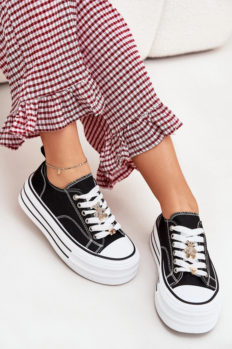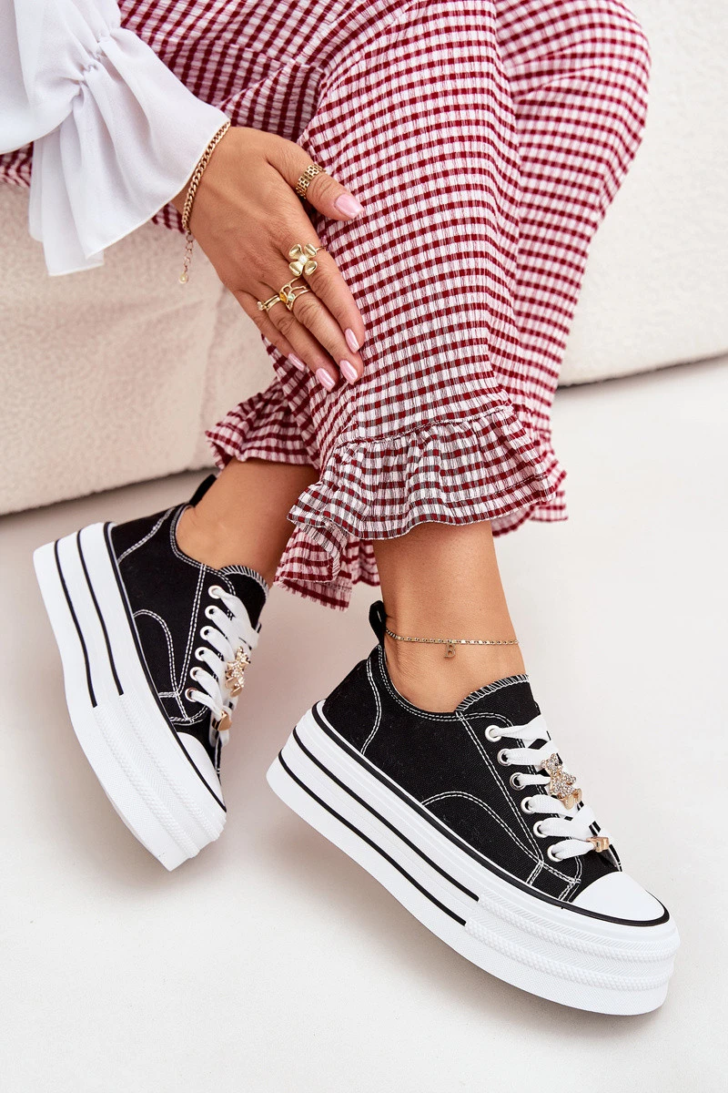 Dámské tenisky z textilního materiálu usazené na masivní platformě jsou módní návrh pro každý den. Šněrovací, s dalšími zlatými přívěsky, které jim dodávají stylový akcent. Ideální pro každodenní stylizace, spojují pohodlí s moderním vzhledem, skvěle se hodí jak k kalhotám, tak k šatům. Při výběru velikosti se řiďte tabulkou velikostí.